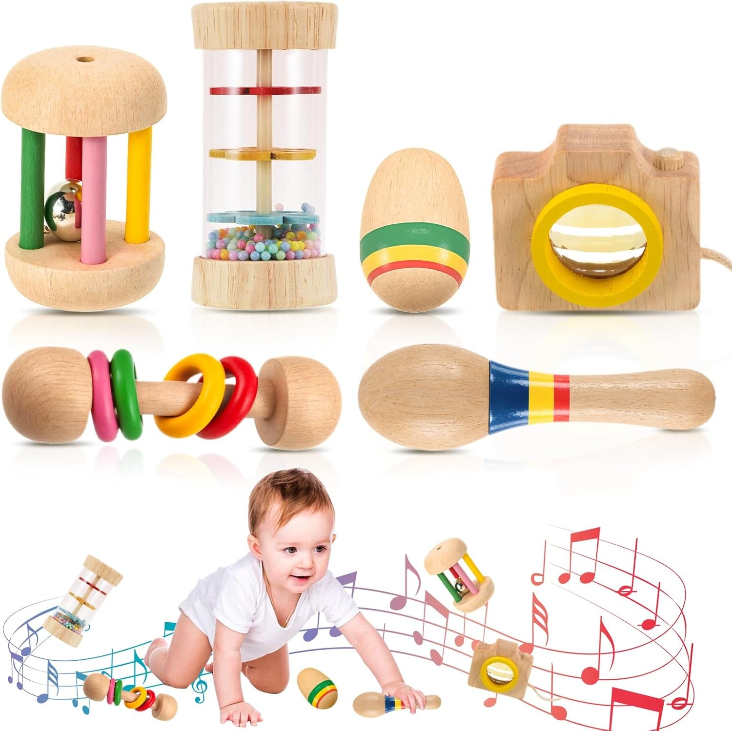 6pcs Different Wooden Baby Toys for 6-12-24 Month Old Toddlers Montessori Toy for 1 Year Old Sensory Musical Rattles Toy Safe and Non-Toxic Wood, Birthday Gift for Boys and Girls