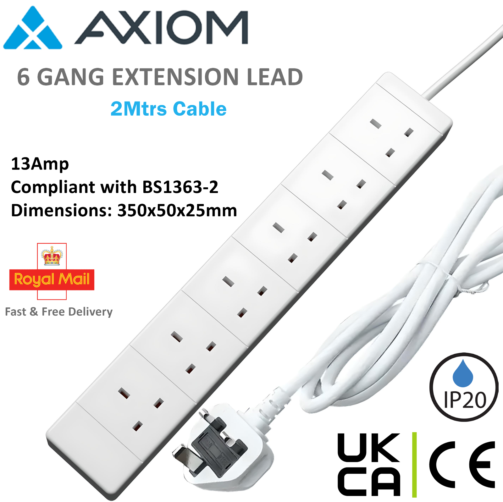 6 Way Extension Lead 2M Surge Protected Power Strip – UK Plug Socket – CE Safe