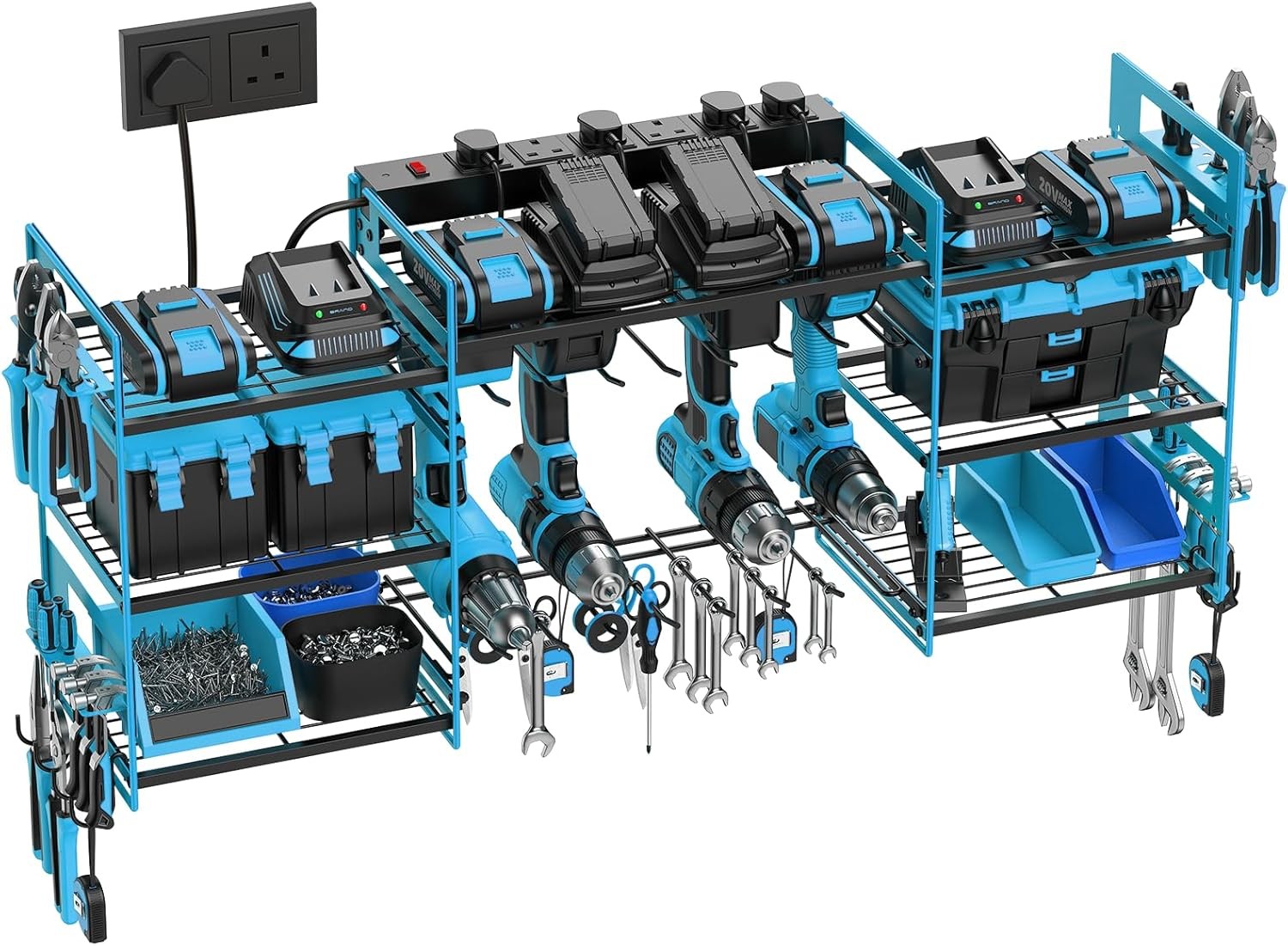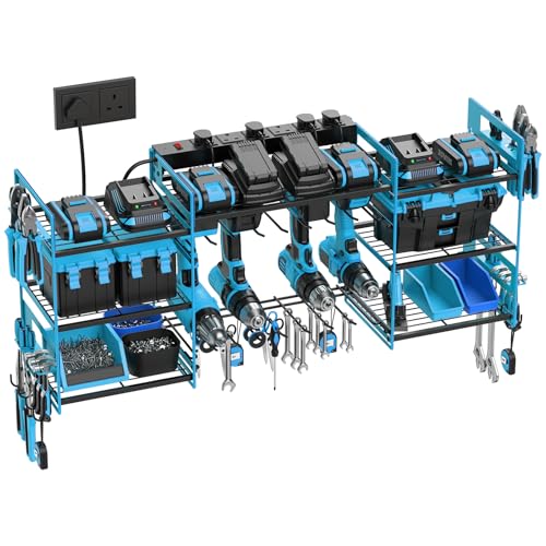 Power Tool Organizer with 6 Way Extension Lead,Large Tools Charging Station,8 Power Drill Tools Heavy Duty Drill Holder Wall Mounted Rack Utility Metal Tool Shelf Storage Organiser for Garage (Blue)