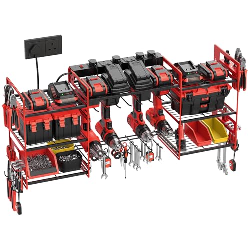 Power Tool Organizer with 6 Way Extension Lead,Large Tools Charging Station,8 Power Drill Tools Heavy Duty Drill Holder Wall Mounted Rack Utility Metal Tool Shelf Storage Organiser for Garage (Red)