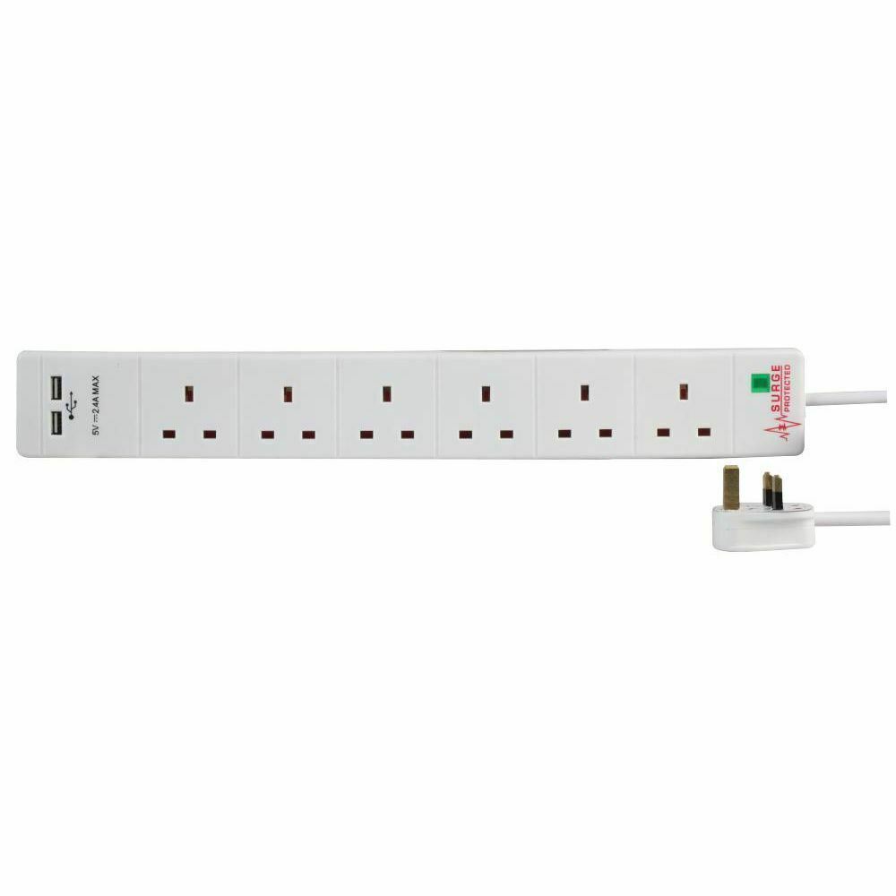 6 Way Extension Lead with 3 Pin UK Plug with Surge Protection - 2 Metres