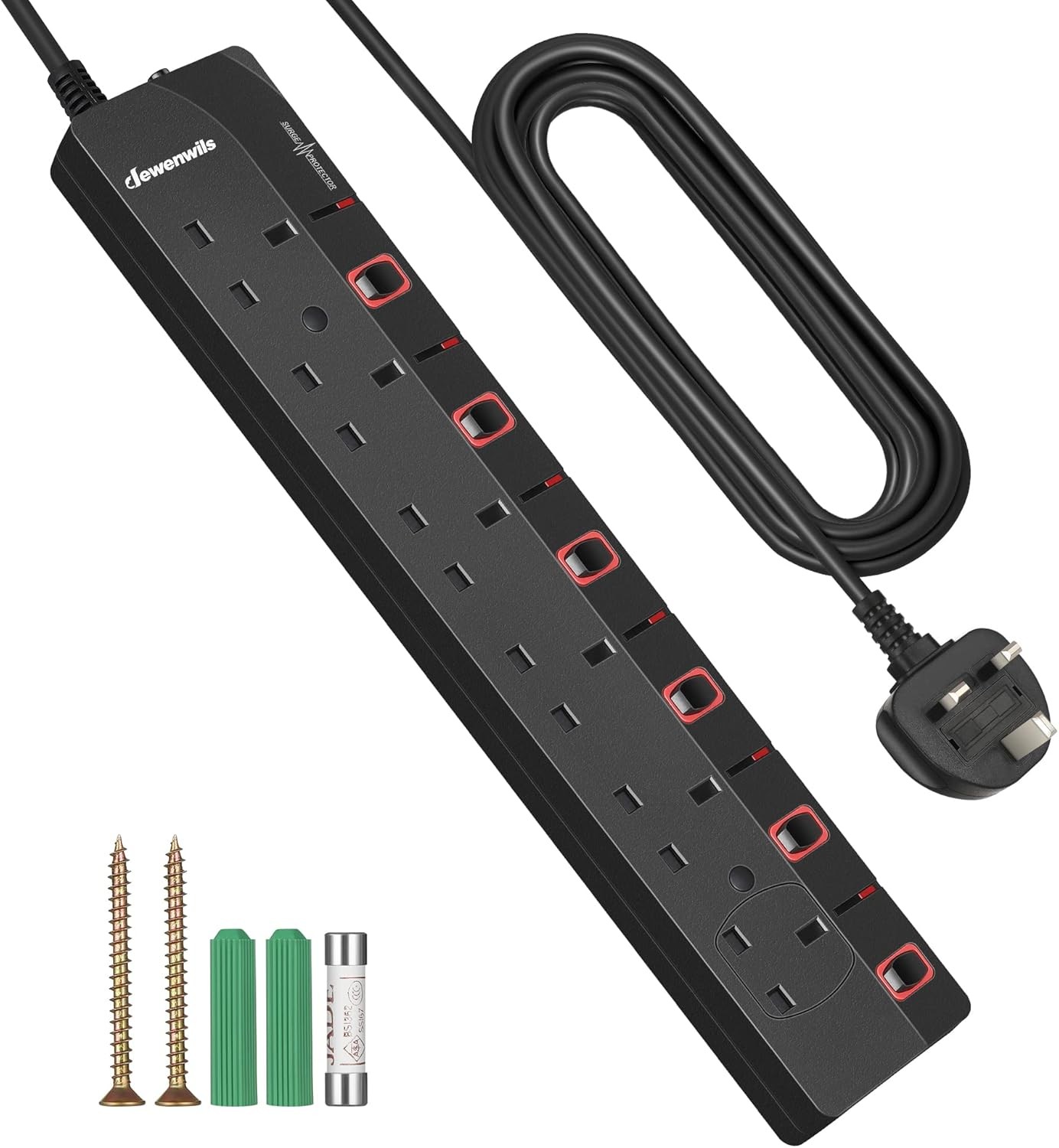 DEWENWILS 6 Way Extension Lead with Individual Switches, Surge Protected Extension Cable 5M with Indicator Lights, 13Amp Extension Cord, Wall Mounted, Black
