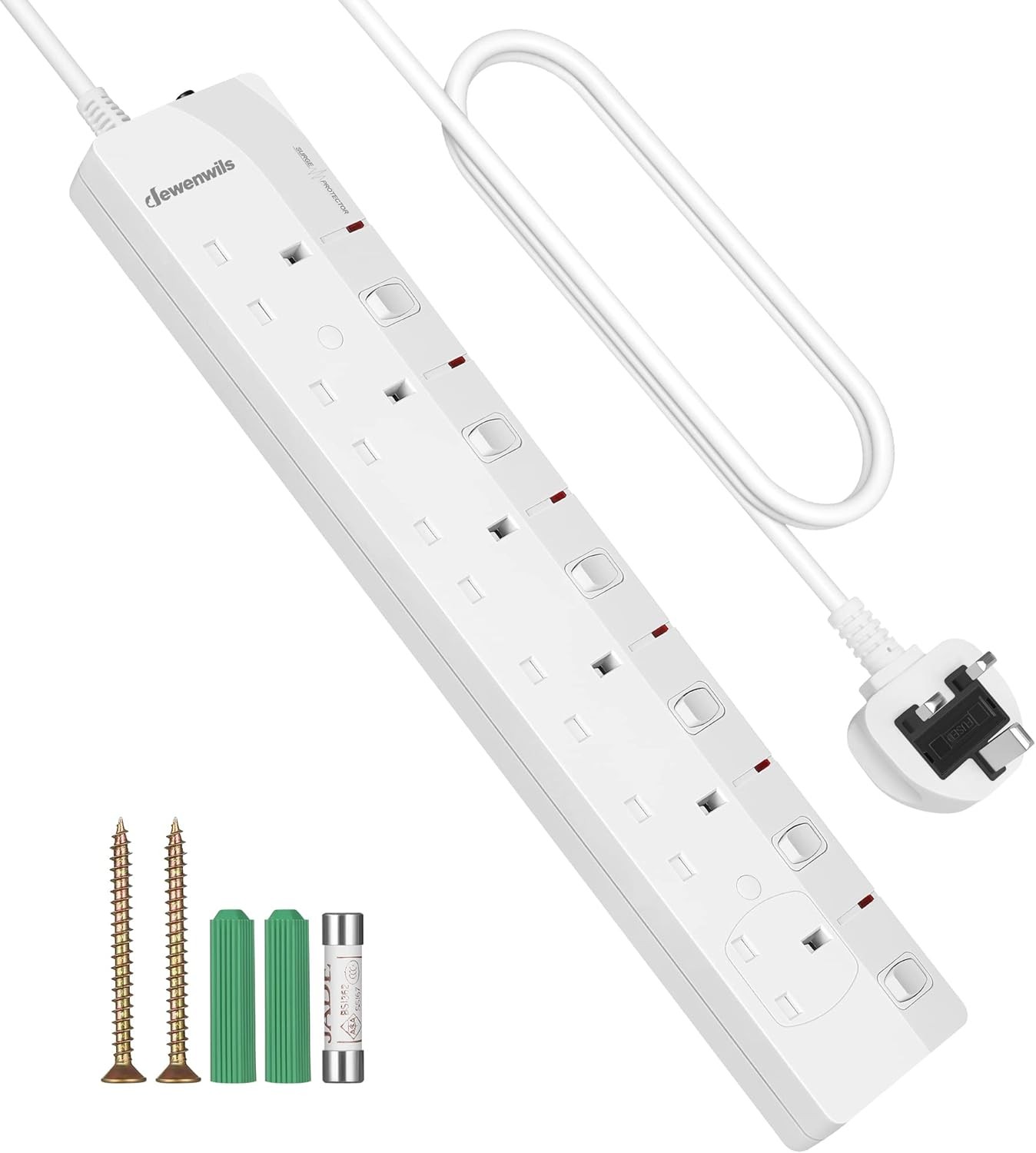 DEWENWILS 6 Way Surge Protected Extension Lead, Individual Switches and Indicator Lights, Extension Cable 3M, 13 Amp 6 Gang Power Strip, 3250W, Wall Mountable, White