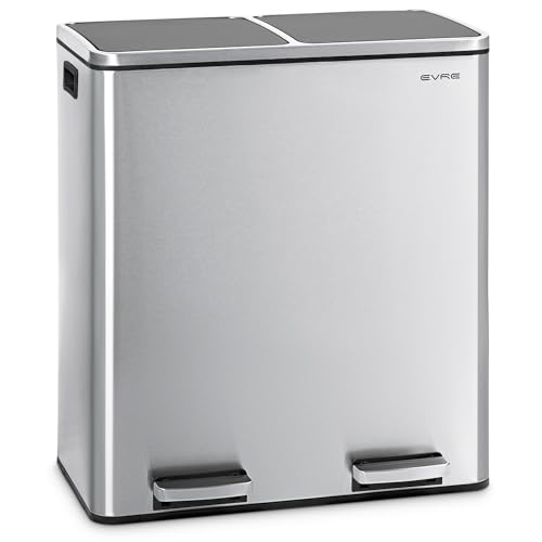 EVRE 60L Kitchen Waste Rubbish Recycling Soft Close Bin 2 x 30L Double Compartment Separation with Removable Plastic Buckets, Odour Seal, Smudge & Fingerprint Resistant (Silver)