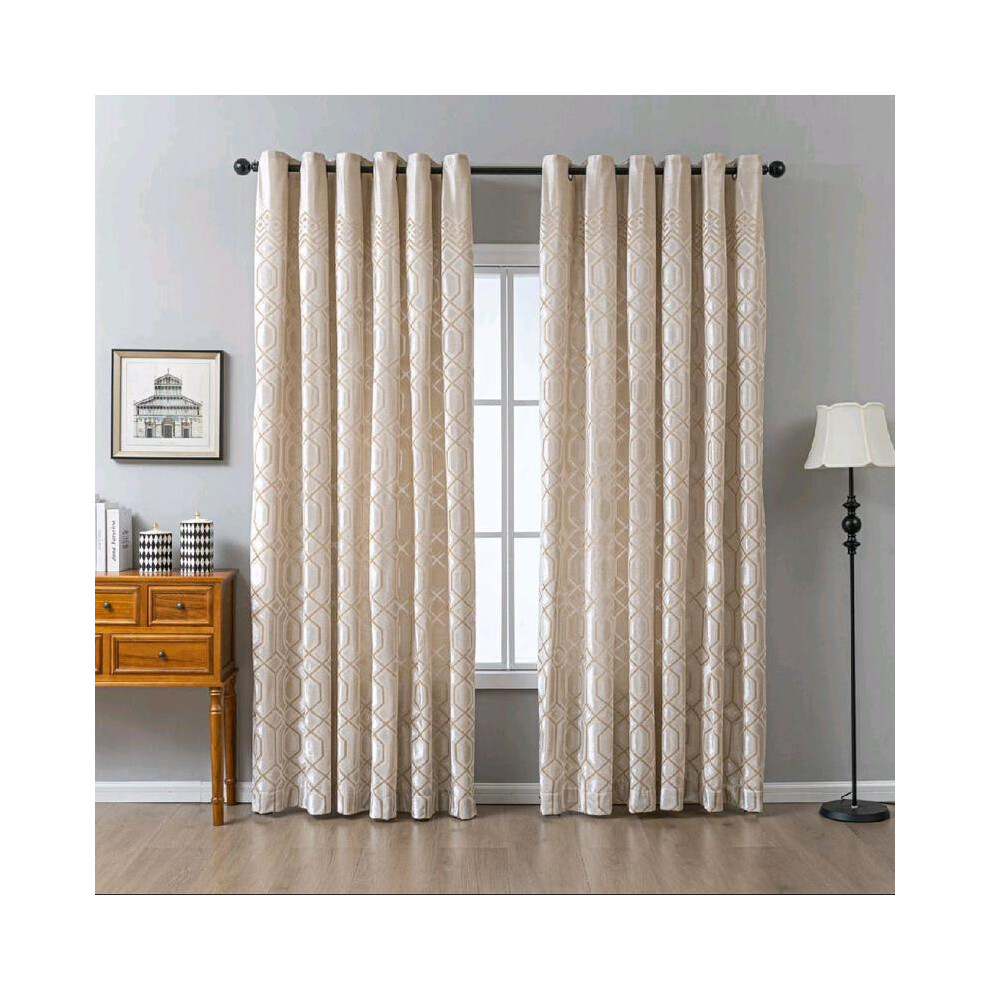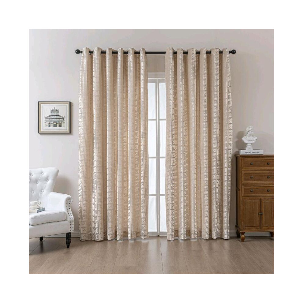 (Geometric Beige, 66x72cm) Luxurious Ready-Made Pairs of Greek Key Crushed Velvet Grommet Ring Top Curtains in Beige, Silver, and Grey