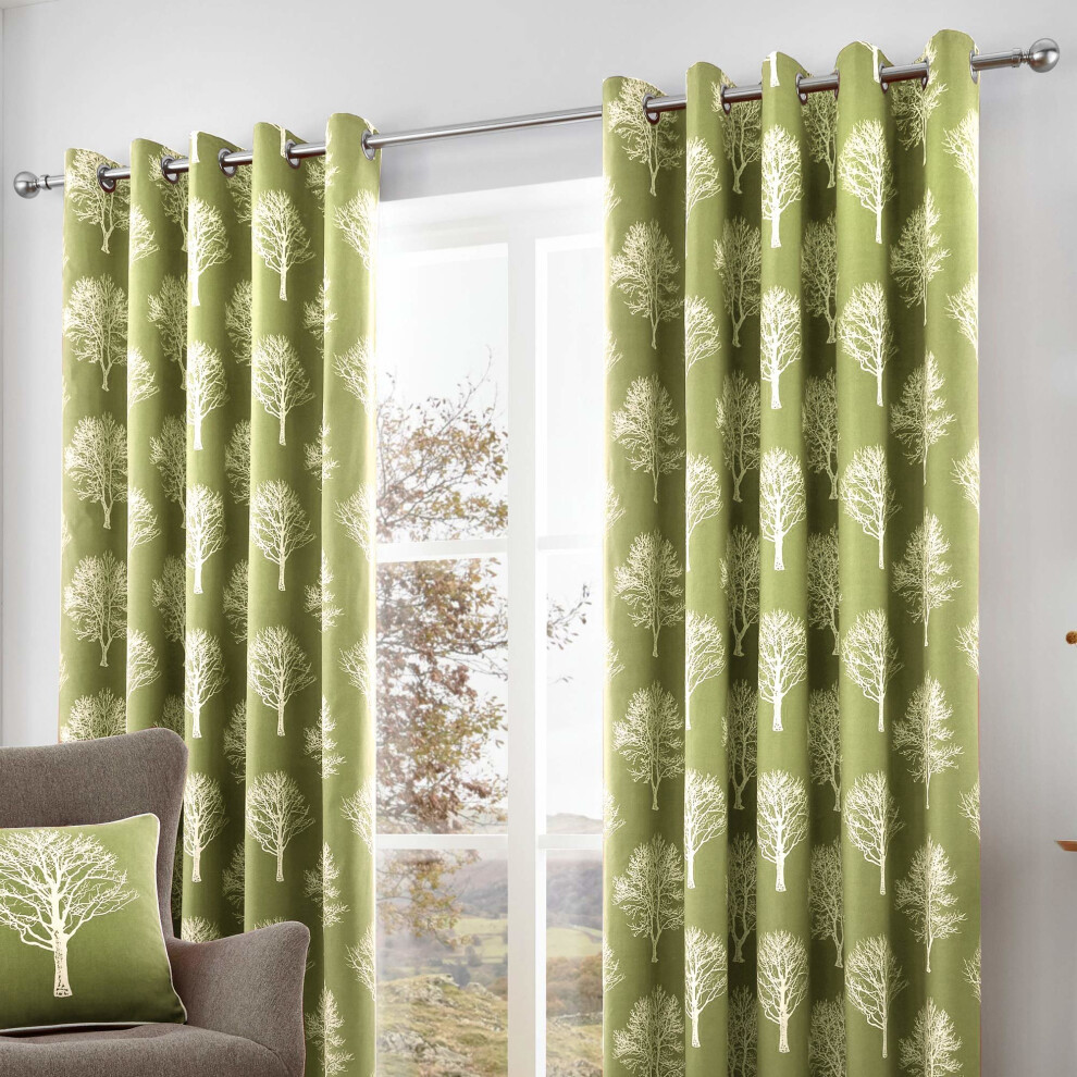 Fusion - Woodland Trees - 100% Cotton Ready Made Lined Eyelet Curtains - 66" Width x 72" Drop (168 x 183cm) in Green