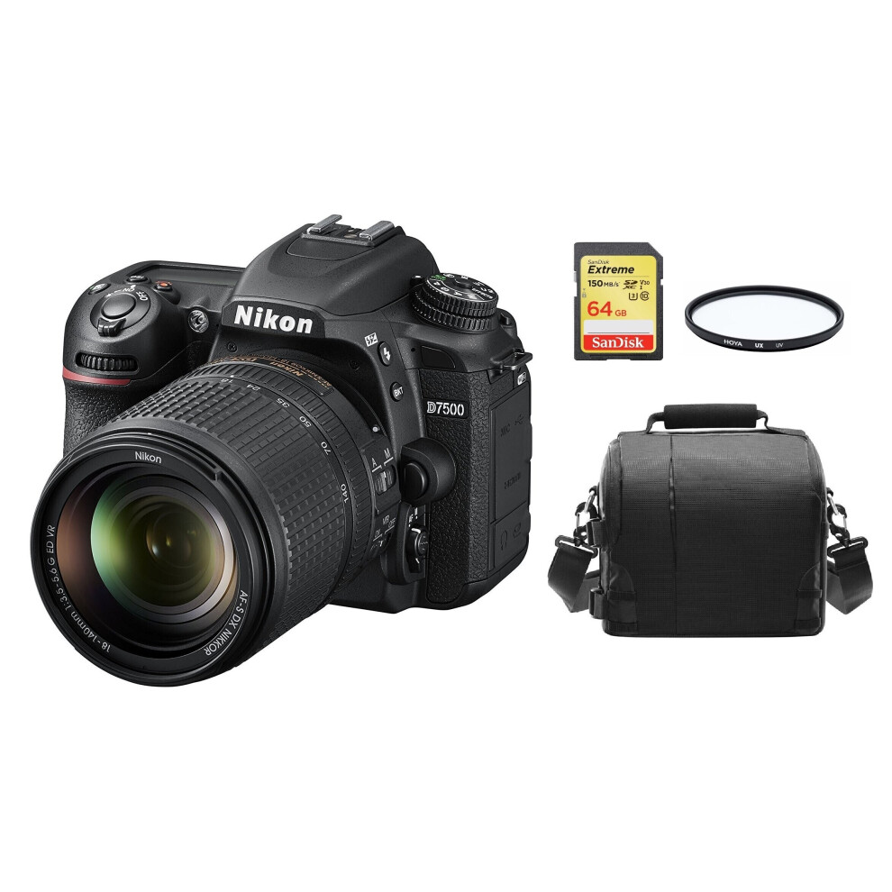 Nikon D7500 Kit with AF-S 18-140mm VR DX Lens, 64GB SanDisk Extreme Card, 67mm Hoya UV Filter & Camera Bag