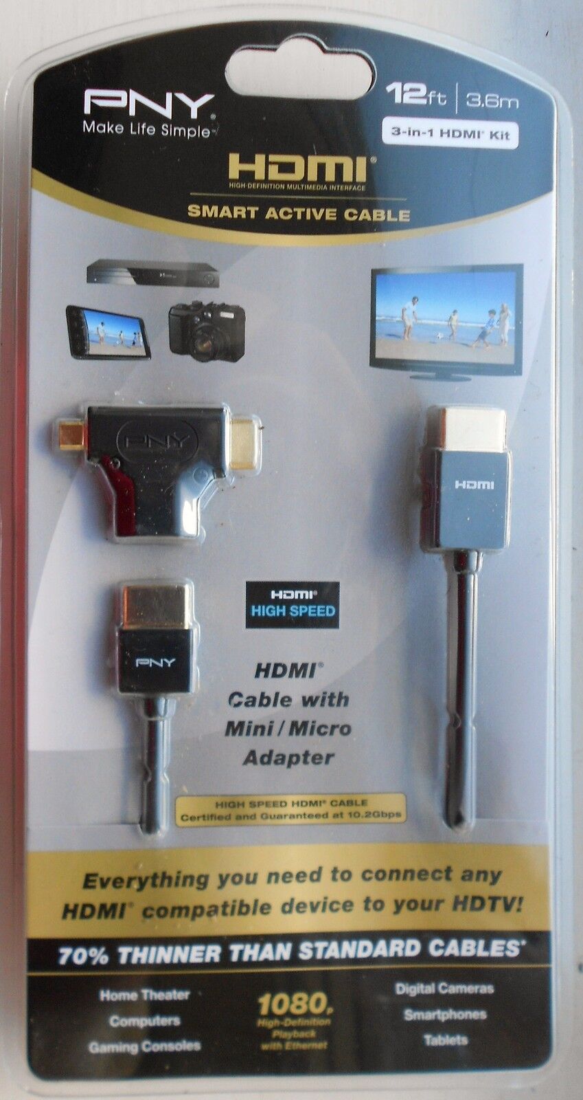 PNY HDMI CABLE 3.6m 12ft LONG 1080p + mini/micro adapter high speed