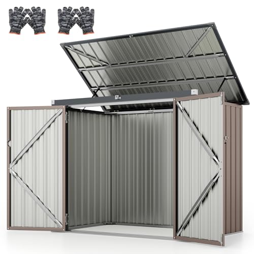 TANGZON 6 x 3 FT Metal Garden Shed, Outdoor Trash Can Storage Shed with Top Flip Cover, Hydraulic Gas Rod & Lockable Door, Weatherproof Gardening Tool Organizer for Backyard Lawn Patio (Grey + Brown)