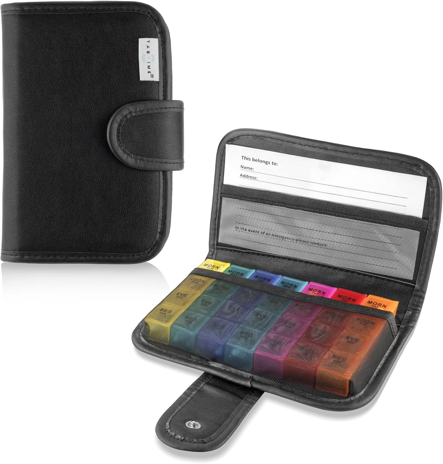 Tabtime Black Pill/Tablet Wallet, Weekly 7 Day Pill Box Organiser with 28 Compa