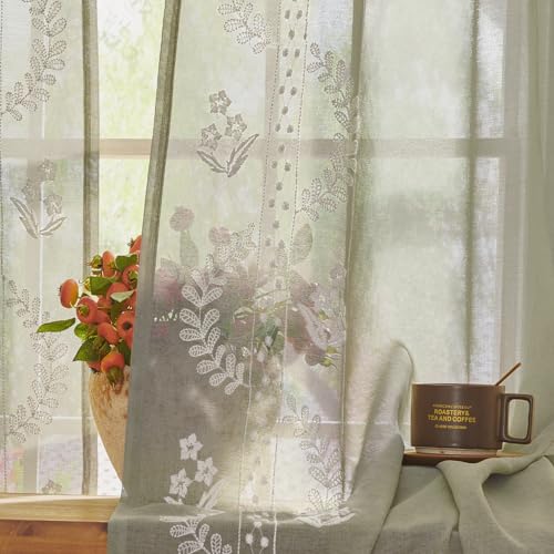 TOPICK Embroidery Floral Net Curtains for Windows Bedroom 72 Inch Drop Long, Linen Look Light Filtering Voile Curtains, Semi Transparent Sheer Curtains for Living Room, Green, 55W x 72L Inch, 2 Panels