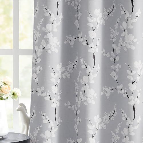 Fmfunctex Grey Floral Blackout Curtains for Bedroom 72 inch Drop Eyelet Curtains for Living Room Nursary Blossom Thermal Insulated Window Curtain Panels 2 Panels White on Grey