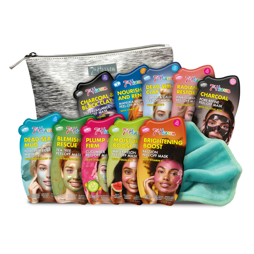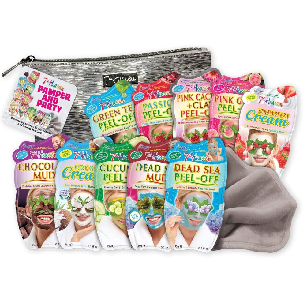 7th Heaven Pamper & Party Bundle with 10 Facial Skincare Masks - Includes a Silver Cosmetics Bag and a Cleansing Face Cloth