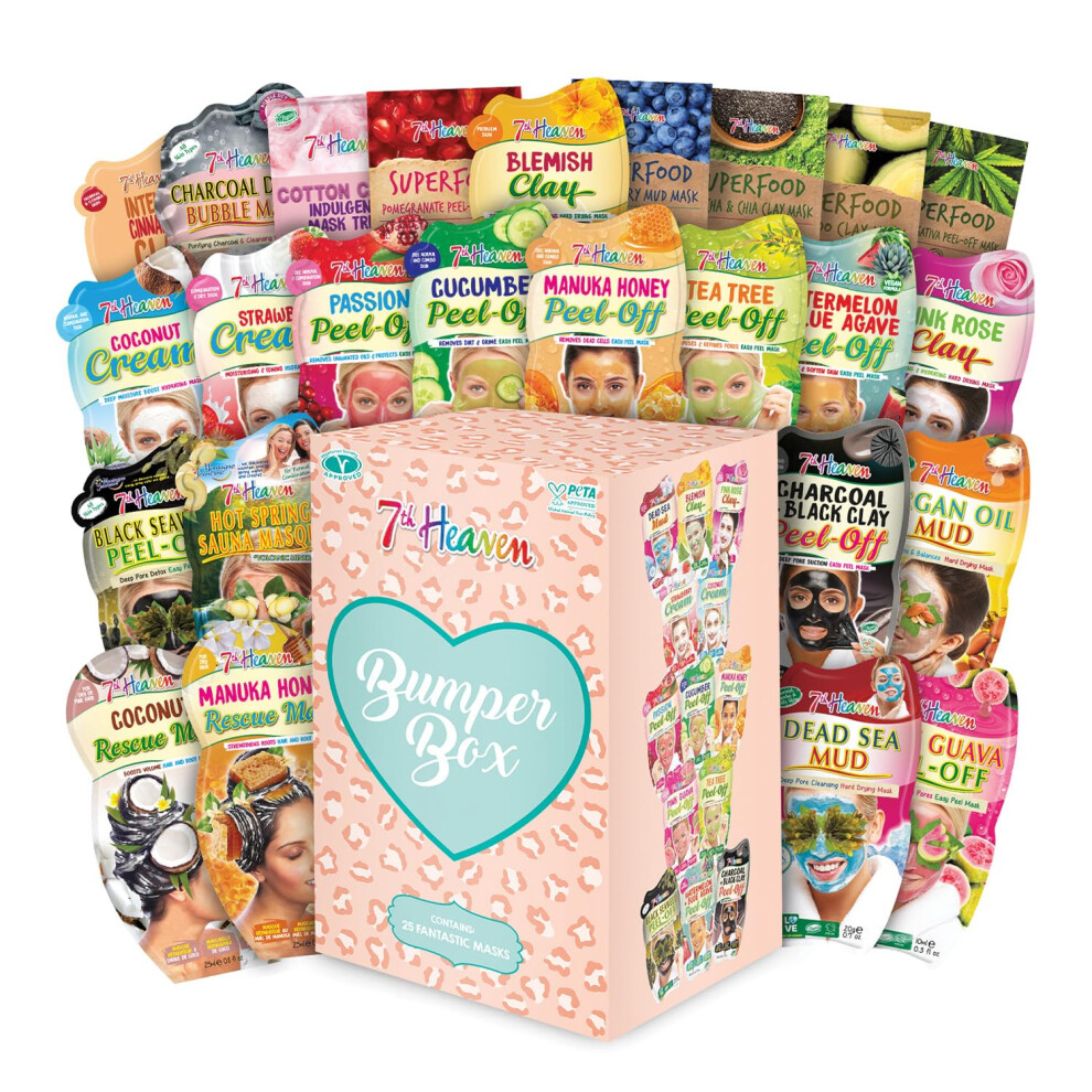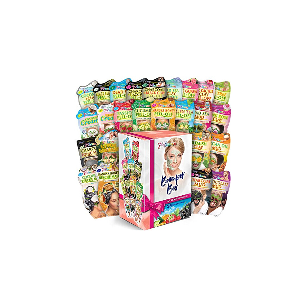 7th Heaven Bumper Box Pamper Gift Set (25 Masks). Clay, Mud & Peel Off Face Masks and Nourishing Hair Masks (Contents May Vary), Pamper Gifts for