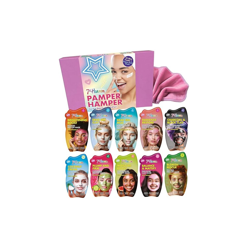 7th Heaven Luxury Pamper Hamper - 10 Face Masks & Spatula - Beauty Gift Set for Women - Skincare Set with Peel-Off, Clay & Hydrating Masks - Spa Experience at Home Skin Care