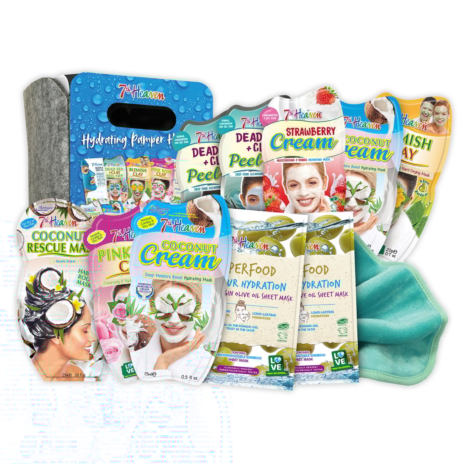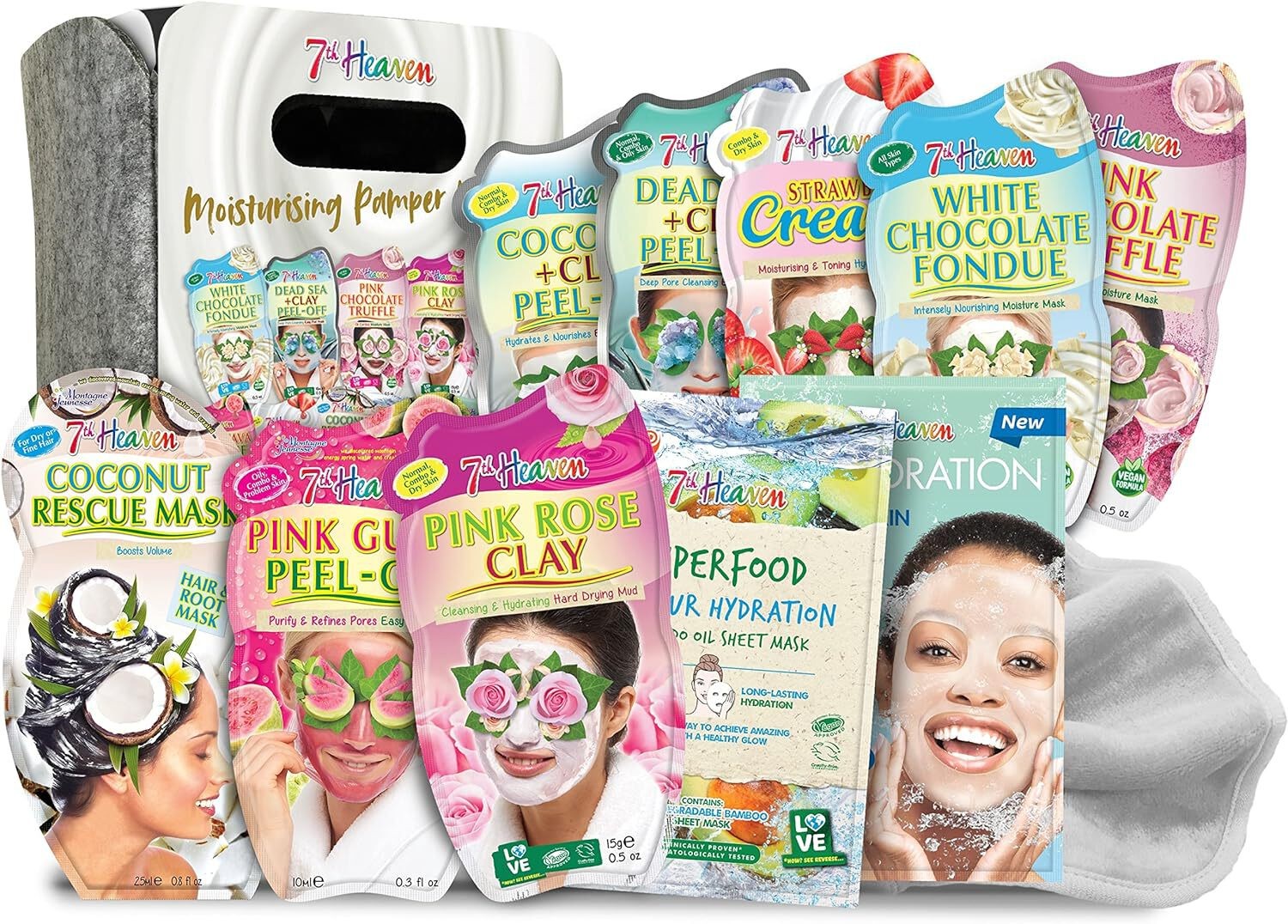 7th Heaven Hydrating Pamper Hamper Gift Set 9 Face Masks Hair Masque Soft Cloth