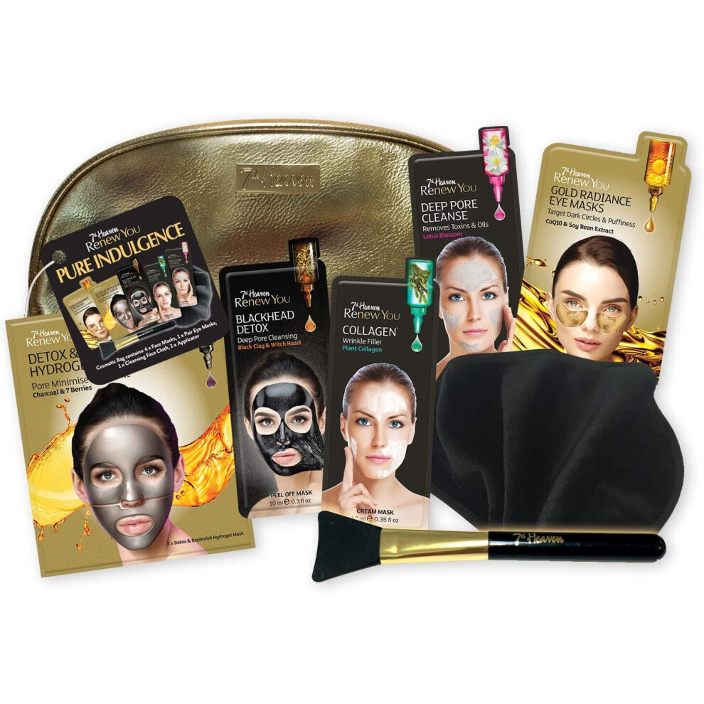 7th Heaven Renew You Pure Indulgence Gift Set - Includes a Variety of Renew You Masks with Gold Cosmetics Bag, Soft Black Cleansing Face Cloth and
