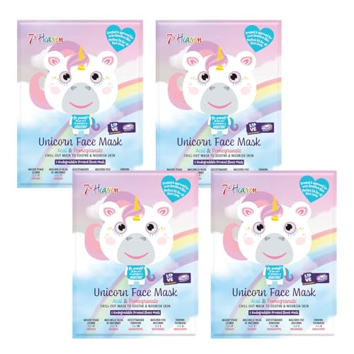7th Heaven Unicorn Face Mask Gift Set (4 Kids Face Masks). Hydrating for Sensitive Skin, Childrens Age 8+, Cruelty Free Sheet Masks - Genuine 7th Heaven Face Masks Skincare