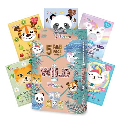 7th Heaven Go Wild Animal Face Sheet Mask Gift Set – 5 Fun Hydrating Masks for Kids with Coconut, Apple, Aloe & Banana – Gentle on Sensitive Skin, Perfect for Sleepovers & Party Bags – Cruelty-Free