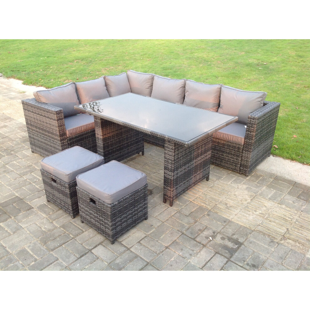 FMSGarden Rattan Garden Furniture Set Outdoor 8 Seater Patio Dining Corner Sofa Sets with Dining Table 2 Small Footstools Dark Grey Mixed