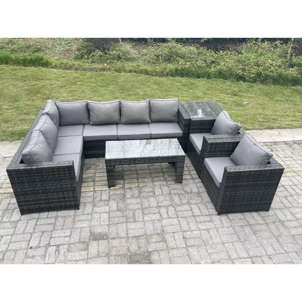 Fimous 8 Seater Rattan Corner Sofa Set With Square Side Table And Oblong Rectangular Coffee Tea Table 2 PC Arm Chair Dark Grey