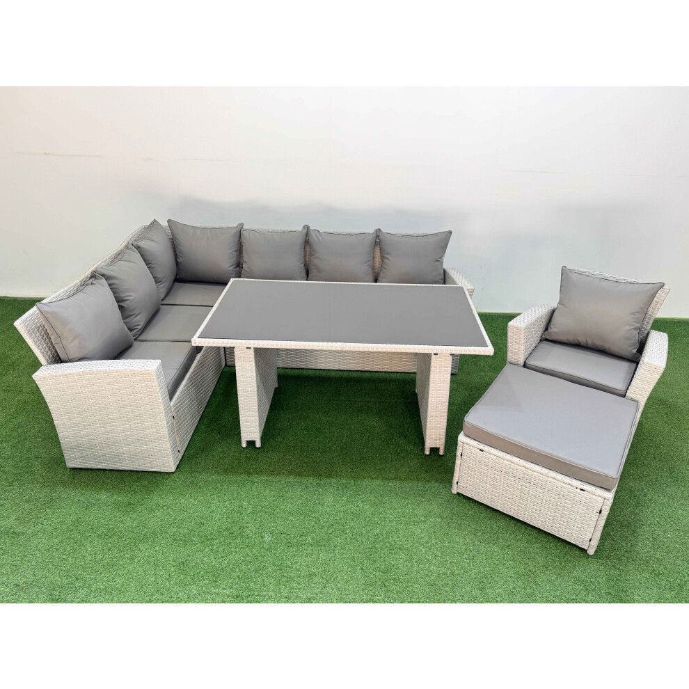 Fimous Outdoor Garden Furniture Sets 8 Seater Wicker Rattan Corner Sofa Sets with Rectangular Dining Table Lounge Sofa 2 Big Footstool Light Grey