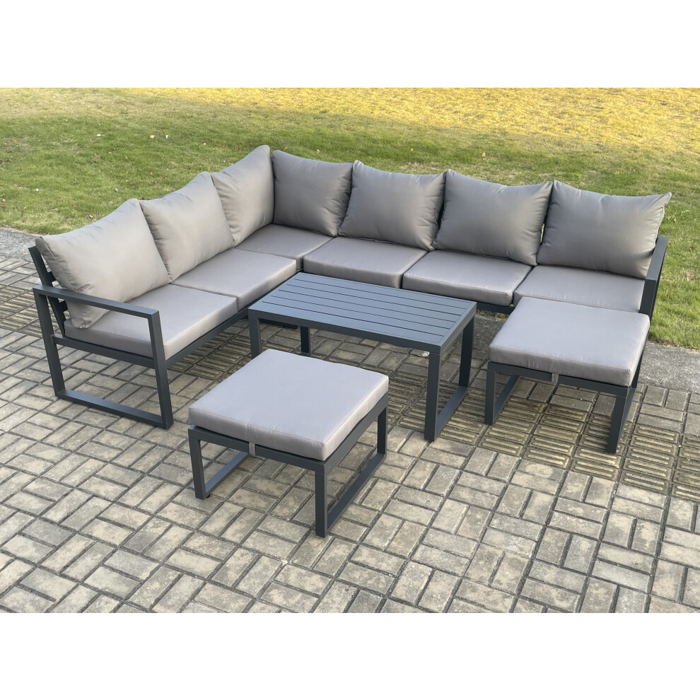 Fimous Aluminum 8 Seater Outdoor Lounge Corner Sofa Set Garden Furniture Sets with Oblong Coffee Table 2 Big Footstool Dark Grey