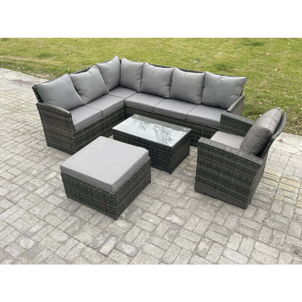 Fimous 8 Seater Rattan Lounge Corner Sofa Set Wicker PE Outdoor Garden Furniture Set with Coffee Table Big Footstool Armchair Dark Grey Mixed