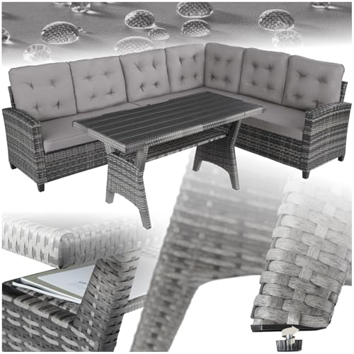 TecTake® Rattan Garden Furniture Set, 8 Seater Corner Sofa, 3 Piece Modular Sofa, 1 Table with Storage Shelf, Comfortable Seat and Back Cushions, for garden, patio, balcony - grey
