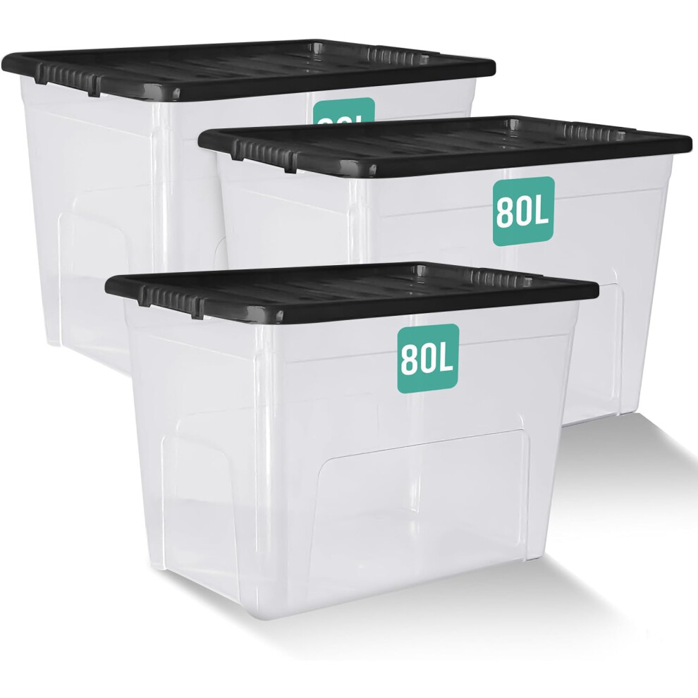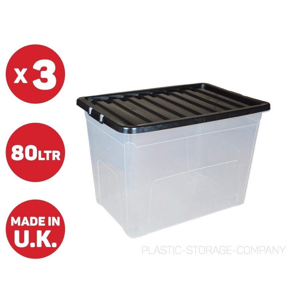 3 X 80 LITRE PLASTIC STORAGE BOX - QUALITY CONTAINER CLEAR WITH BLACK