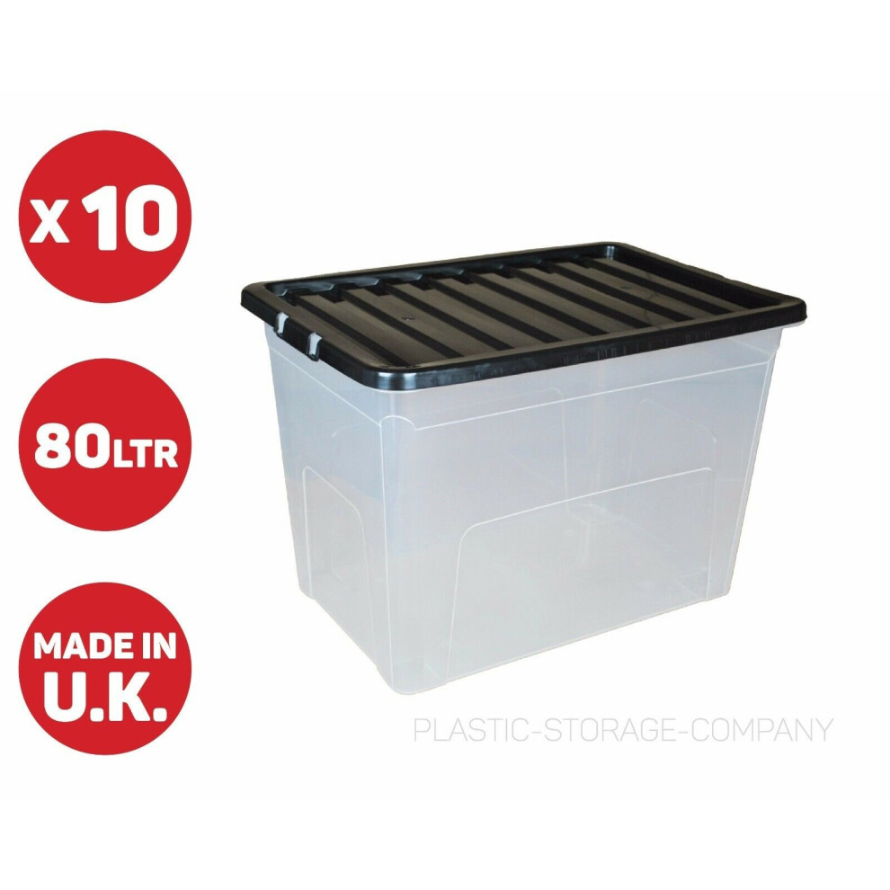 VTL 10 x 80L 80 Litre X Large Plastic Storage Clear Box Strong Stackable Container Black Lid (Pack of 10) MADE IN UK