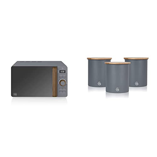 Swan 20L Nordic Digital LED Microwave, 6 Power Levels, Soft Touch Housing and Matte Finish, 800W, Slate Grey, SM22036LGRYN & SWKA17513GRYN Nordic Scandi Set of 3 Storage, Slate Grey, Steel, Bamboo Lid