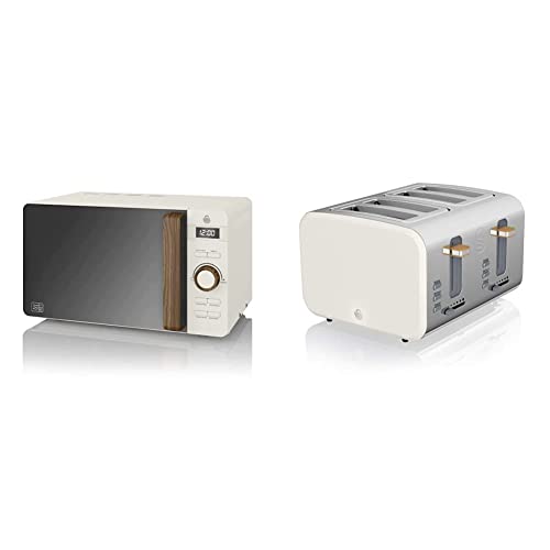 Swan 20L Nordic Digital LED Microwave, 6 Power Levels, Wood Effect Handle, 800W, Cotton White, SM22036LWHTN & ST14620WHTN, 4 Slice Nordic Toaste, 1500W, Cotton White