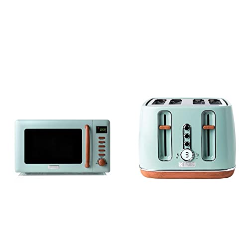Haden Dorchester Sage Green Microwave With Wood Effect Finish, 20ltr Capacity, 800W & Haden Dorchester Toaster – Modern LCD Display Digital Four Slice Toaster With Wood Effect Finish, Matt Sage Green