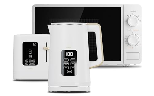 Cello White Uni Bundle: 1.7L 3000W Kettle with Temperature Control & LED Display | 800W Slice Toaster with Digital Timer & High Lift | 800W 20L Digital Microwave, 8 Cooking Functions & Quick Defrost
