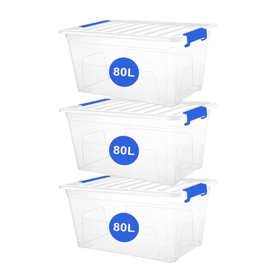 3 x 80L Crystal Storage Box With Lid Clear Plastic Stackable Containers Home UK