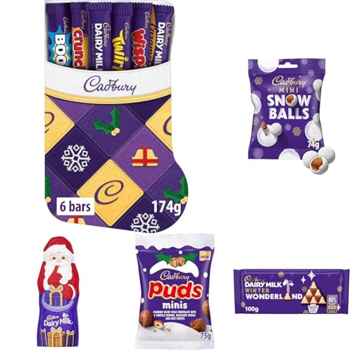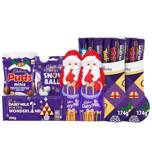 Cadbury Dairy Milk Christmas Stocking Filler Bundle, Includes 2 x Festive Selection Boxes, 74 g Mini Snow Balls Bag, 100 g Bar of Winter Wonderland Chocolate, 2 x 100 g Dairy Milk Large Hollow Santa's