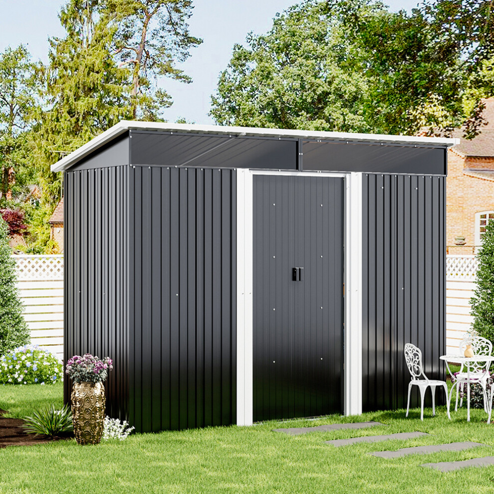Living and Home 8 x 4 ft Metal Garden Storage Shed Pent Roof Double Lockable Sliding Doors with Foundation Base, Charcoal Black