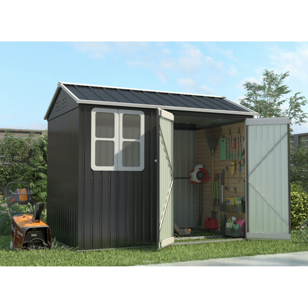 BIRCHTREE Garden Shed Steel Apex Roof House Outdoor Backyard Storage With Lockable Double Doors Window Free Foundation Tool Equipment Organizer Air Vents 8x6FT Anthracite