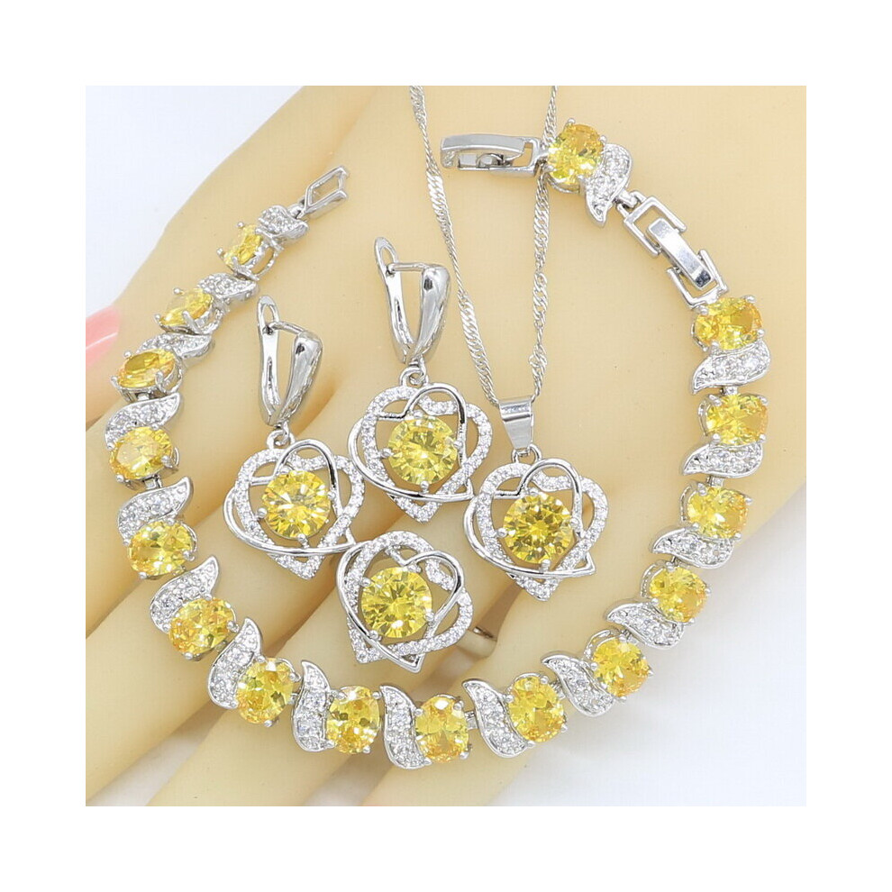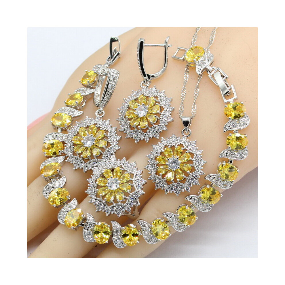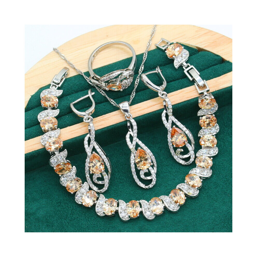 (Light Yellow Gold Color, 9) Silver Jewelry Set for Women Wedding Unique Champagne Zircon Bracelet Pierced Earrings Necklace Ring Christmas Gift Dubai