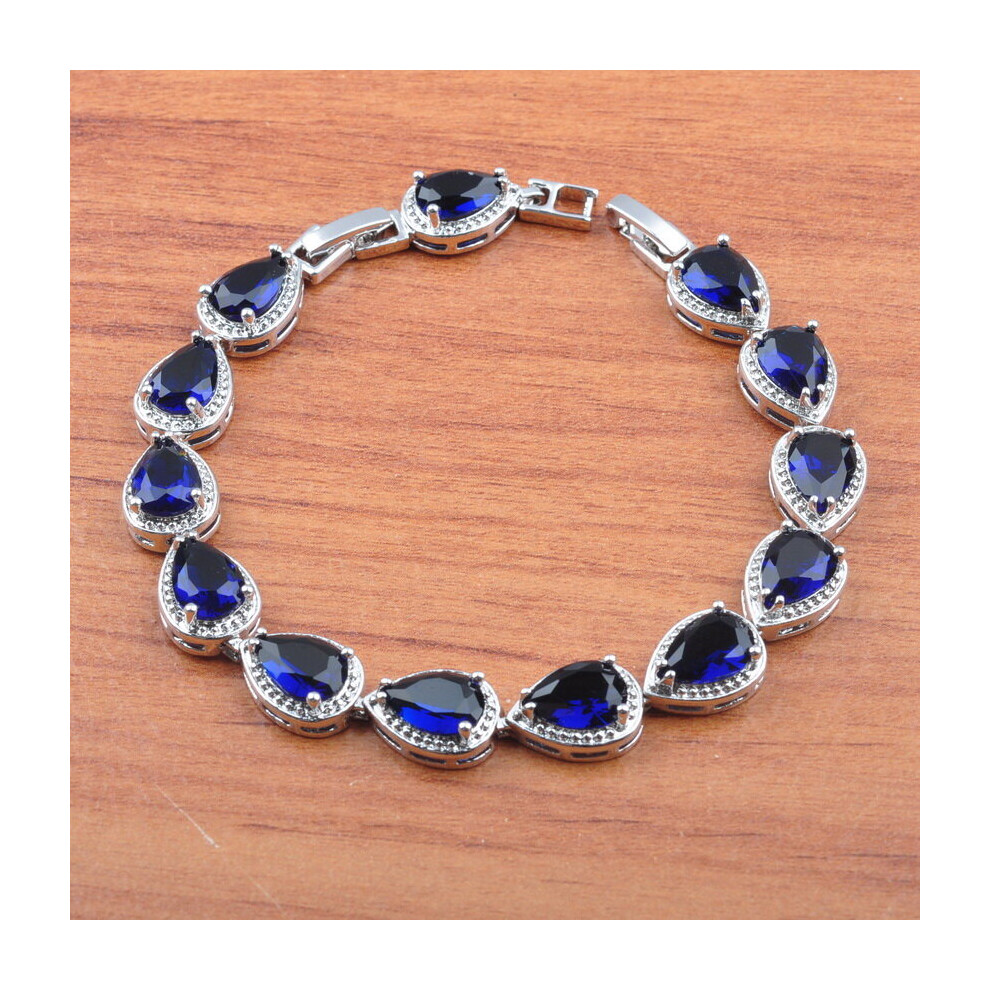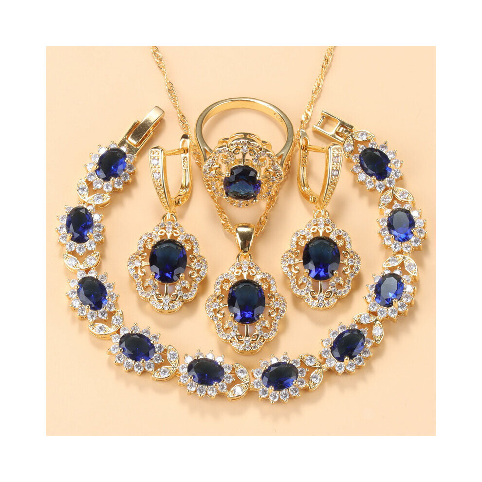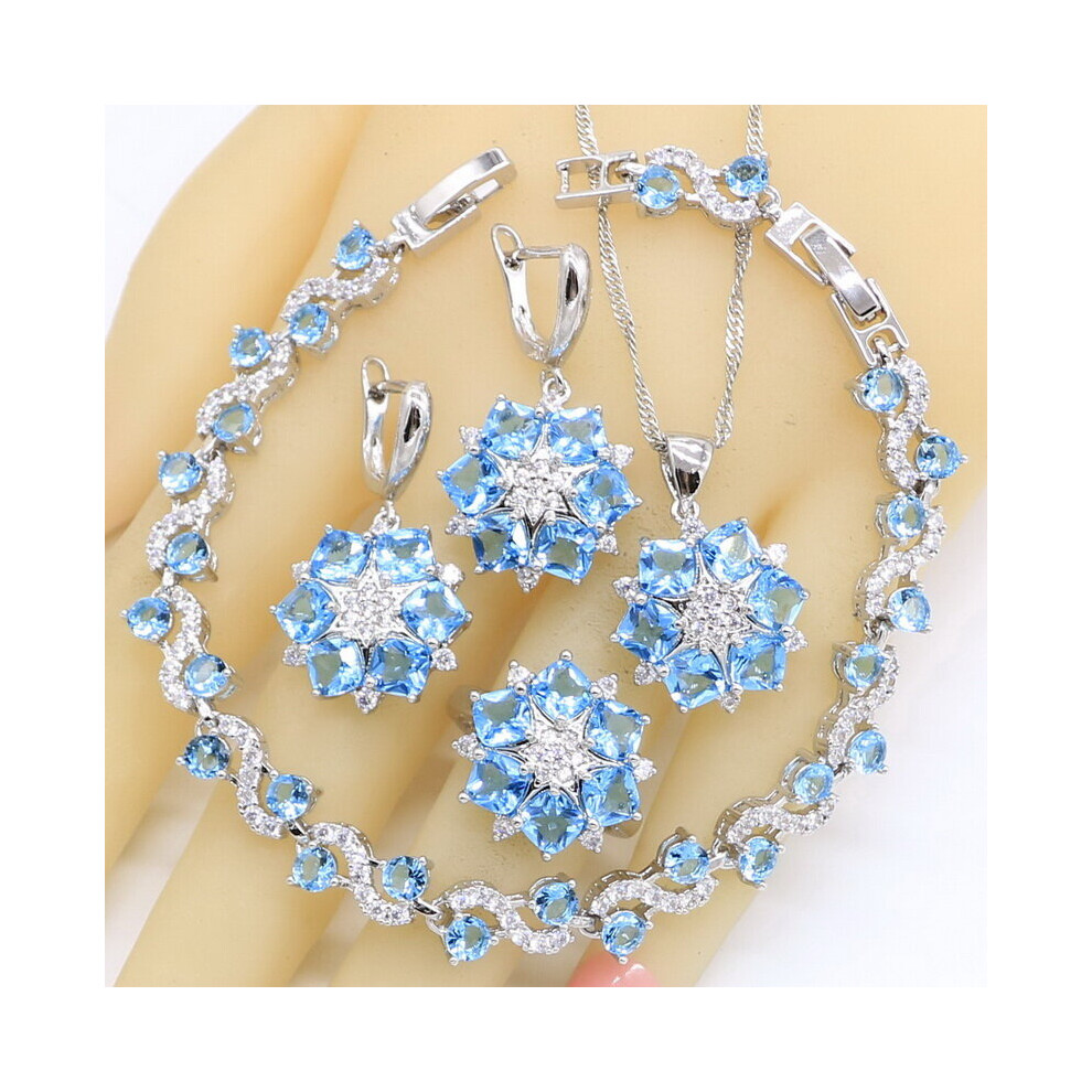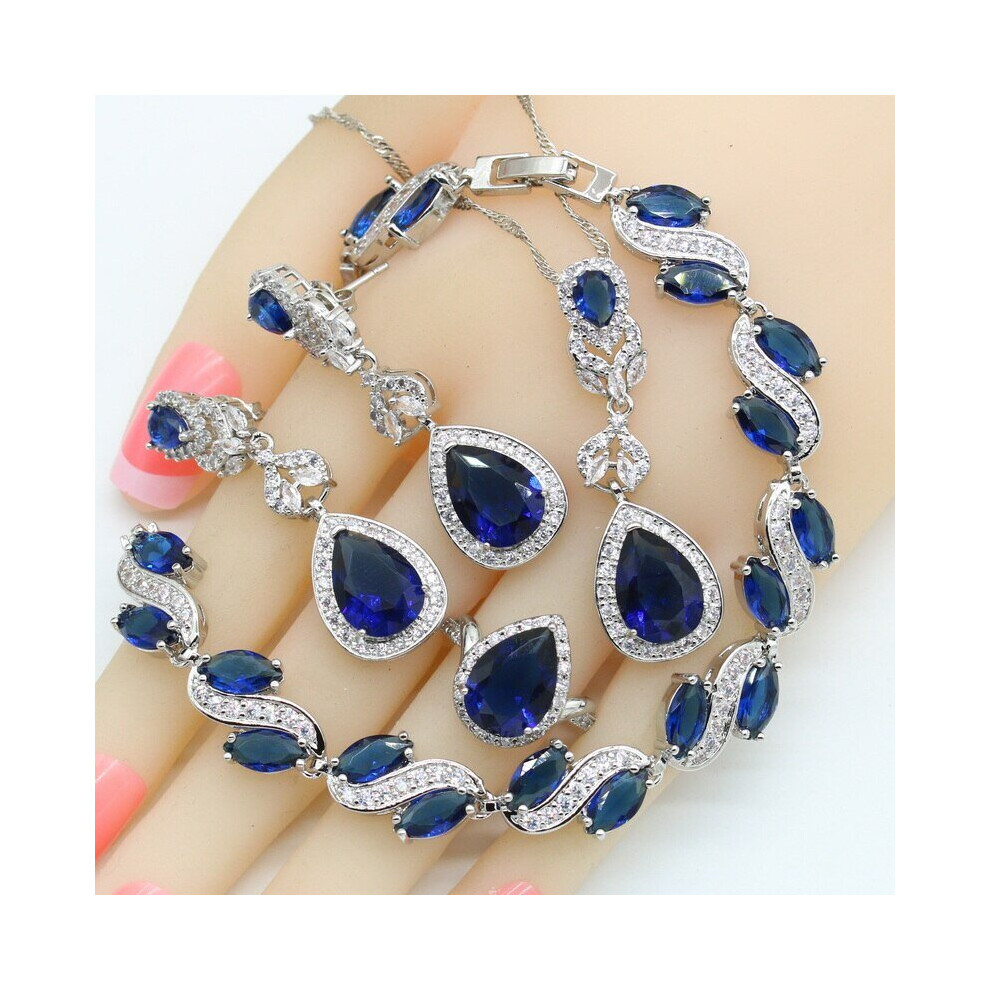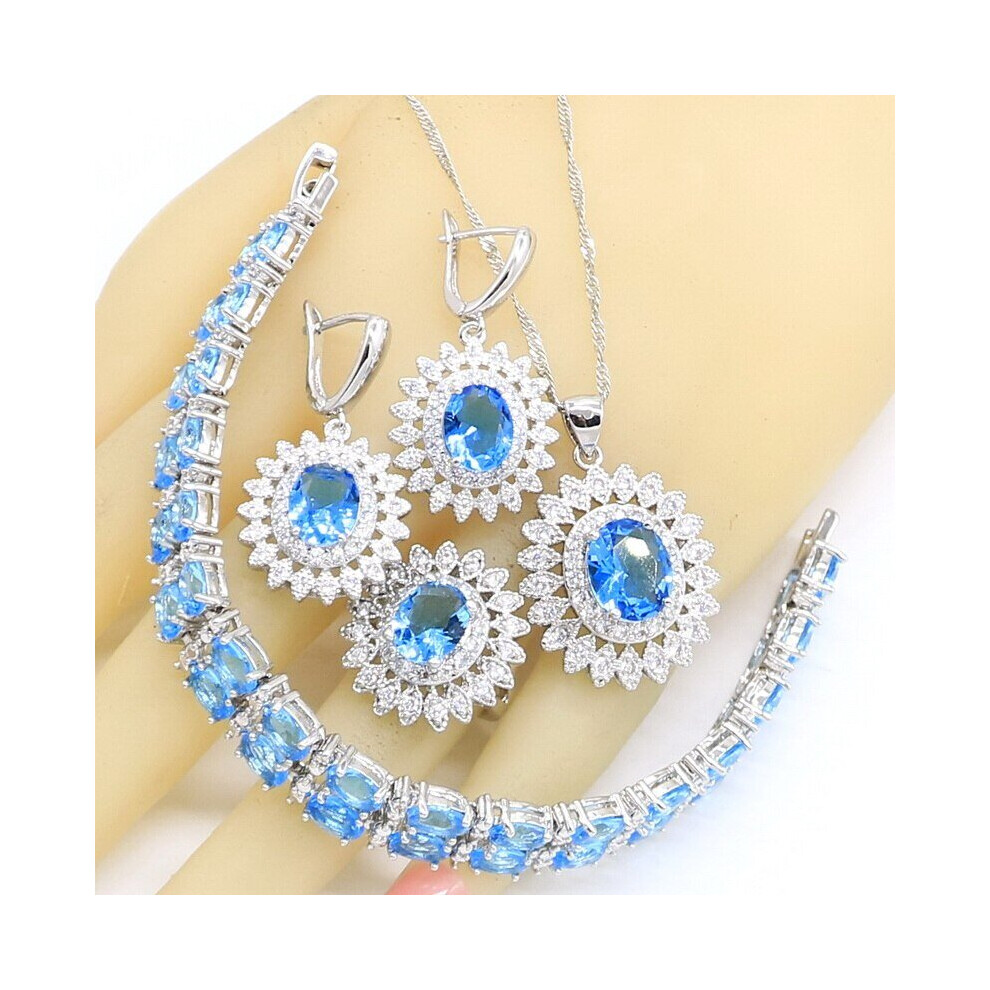 (Blue White Zinc Plated, 9) Sky Stones Dubai Wedding Jewelry Sets For Women Bracelet Earrings Necklace Pendant Ring Bridal Birthday Gift