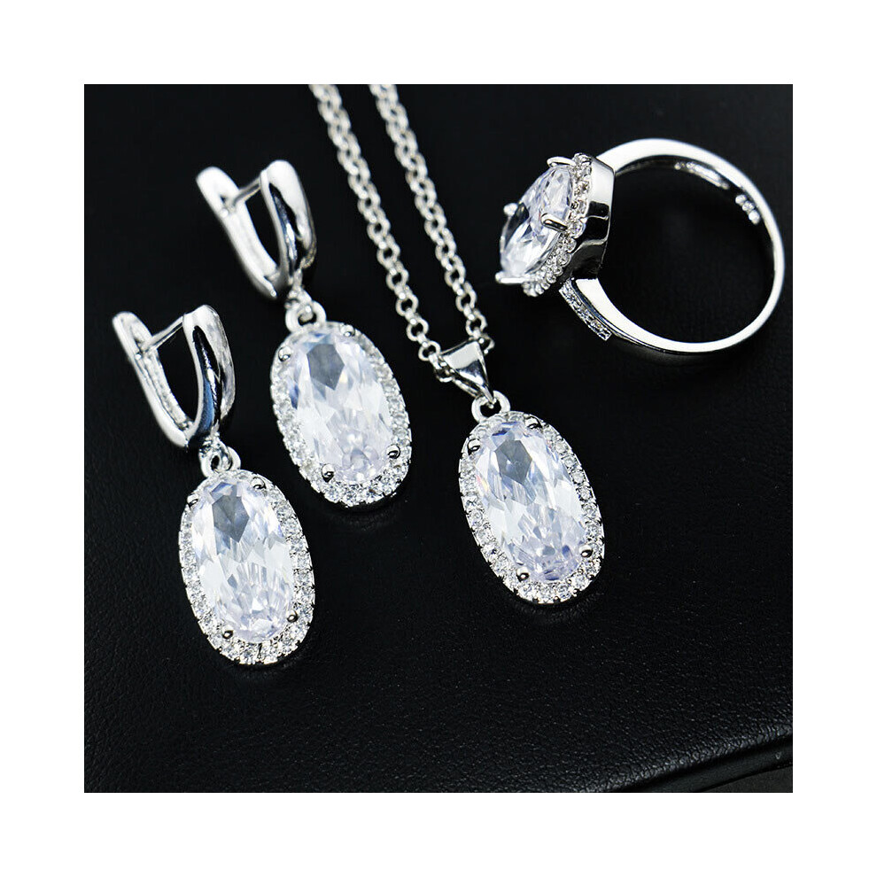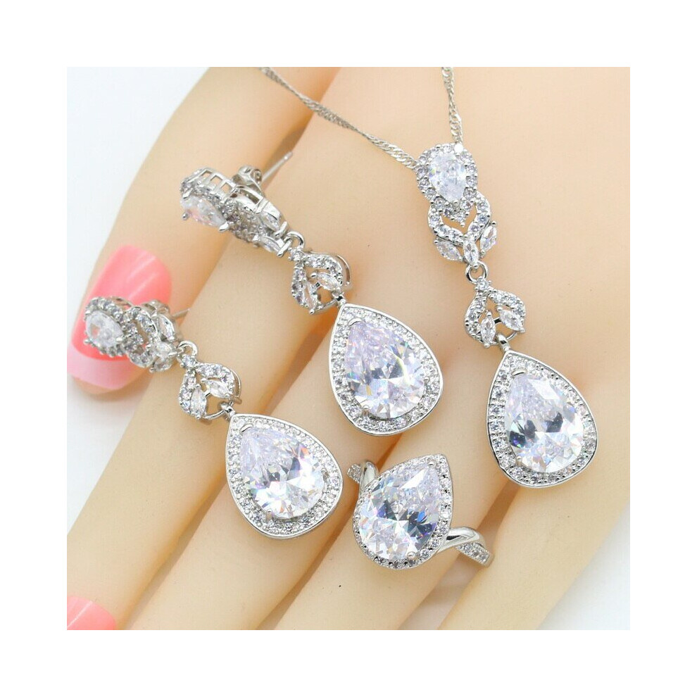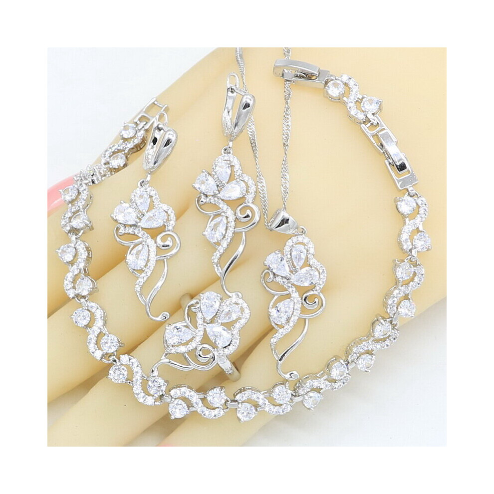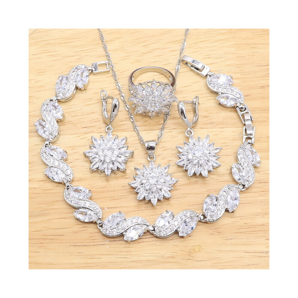 (Rhodium Plated, 9) Light Stones Silver Dubai Bridal Jewelry Sets For Women Bracelet Earrings Necklace Pendant Ring Bridal Birthday Gift