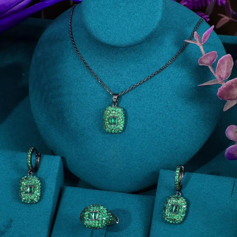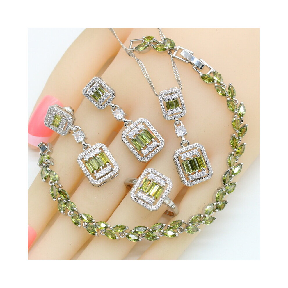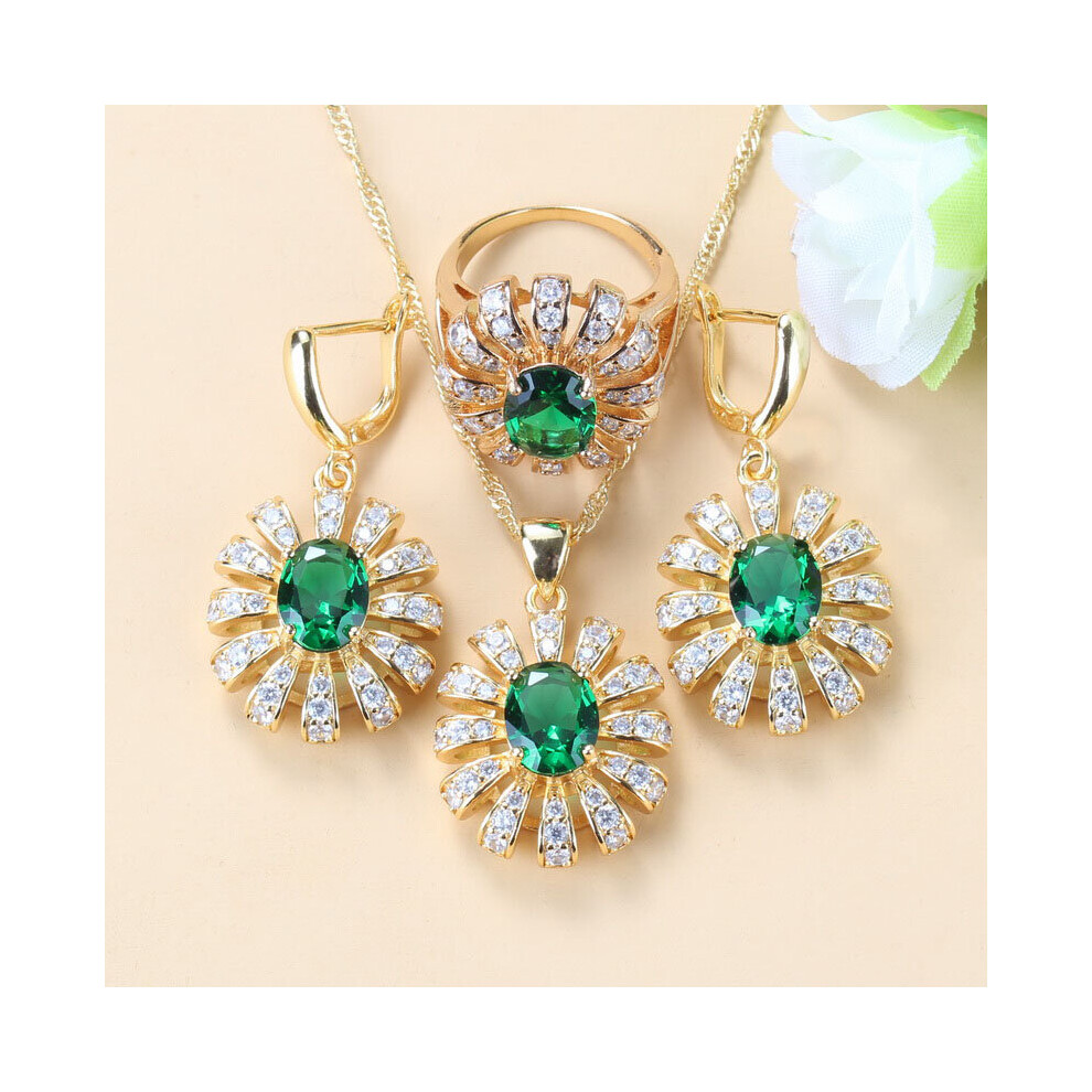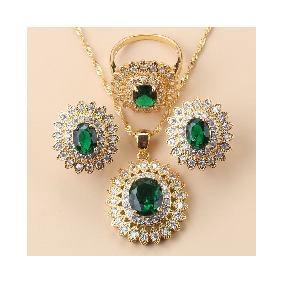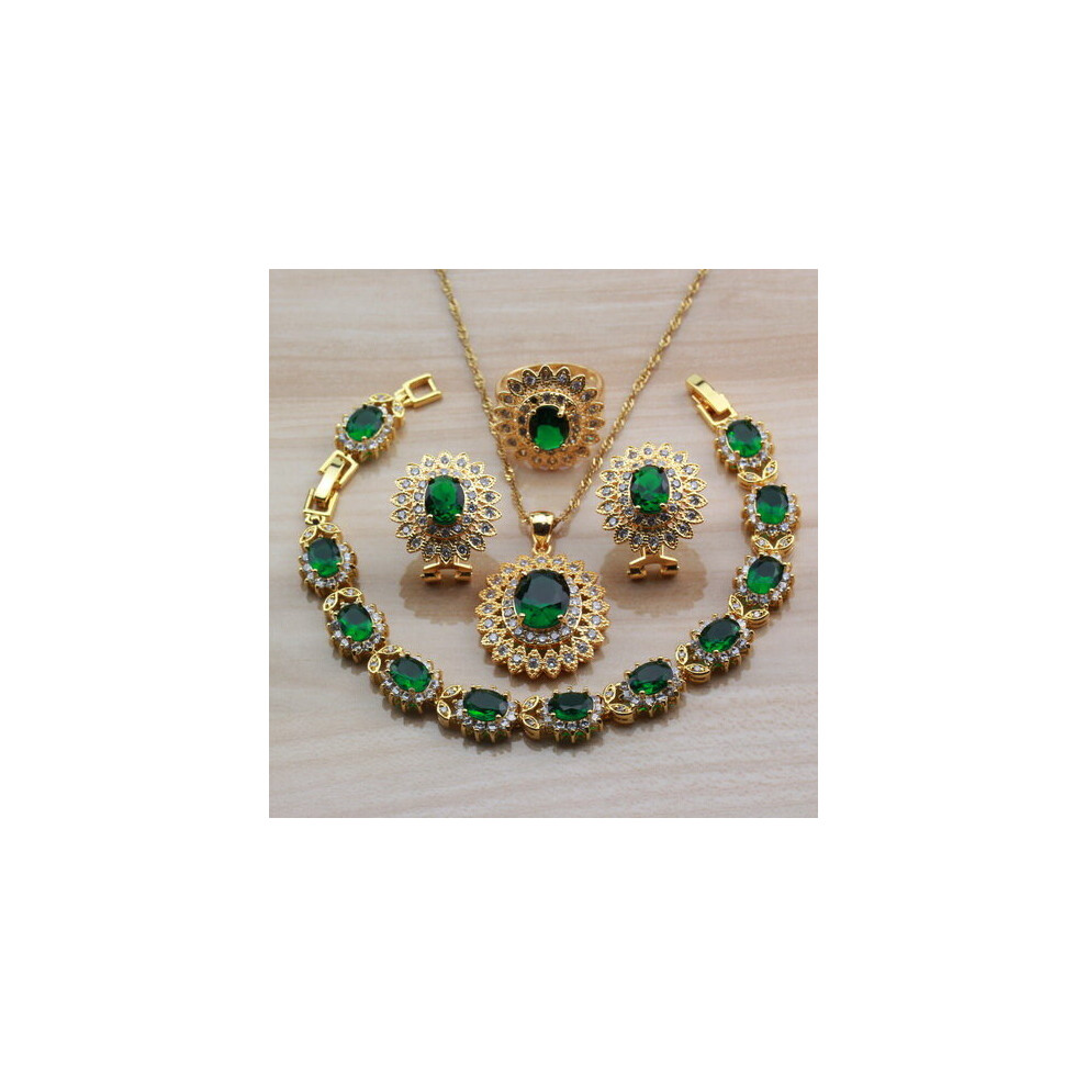 (Light Yellow Gold Color, 9) Green Zirconia Dubai Wedding Jewelry Sets For Women Bracelet Earrings Necklace Pendant Ring Birthday Gift