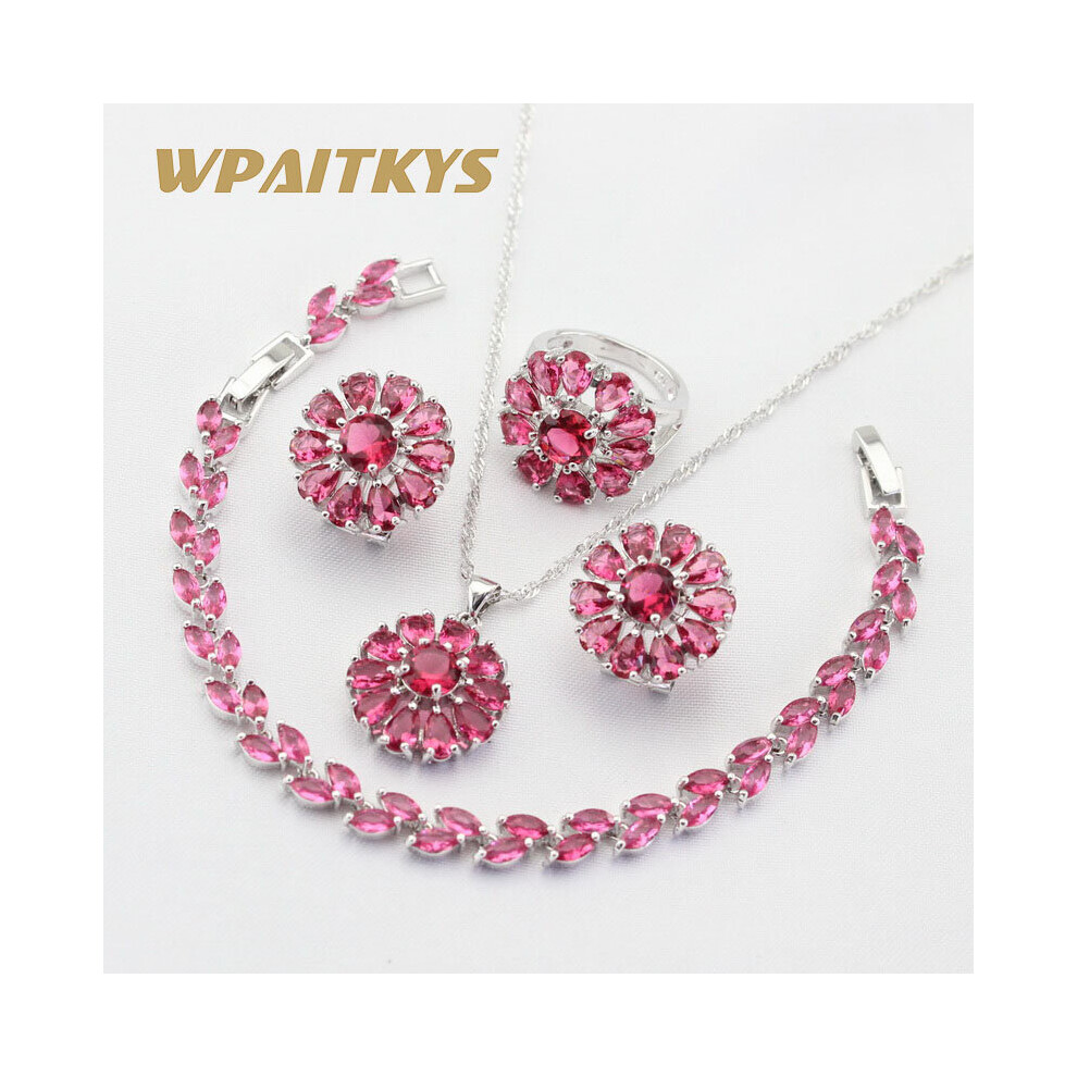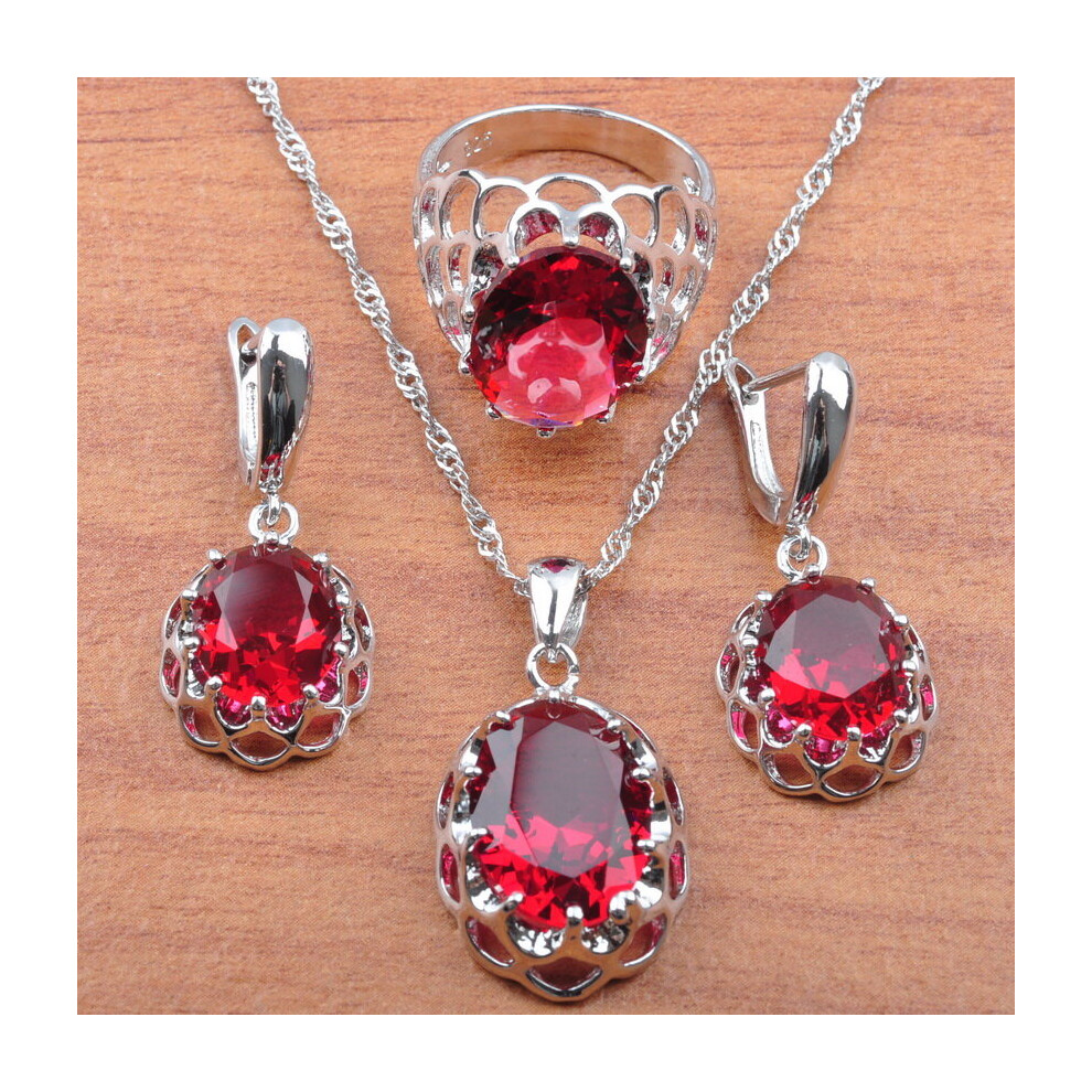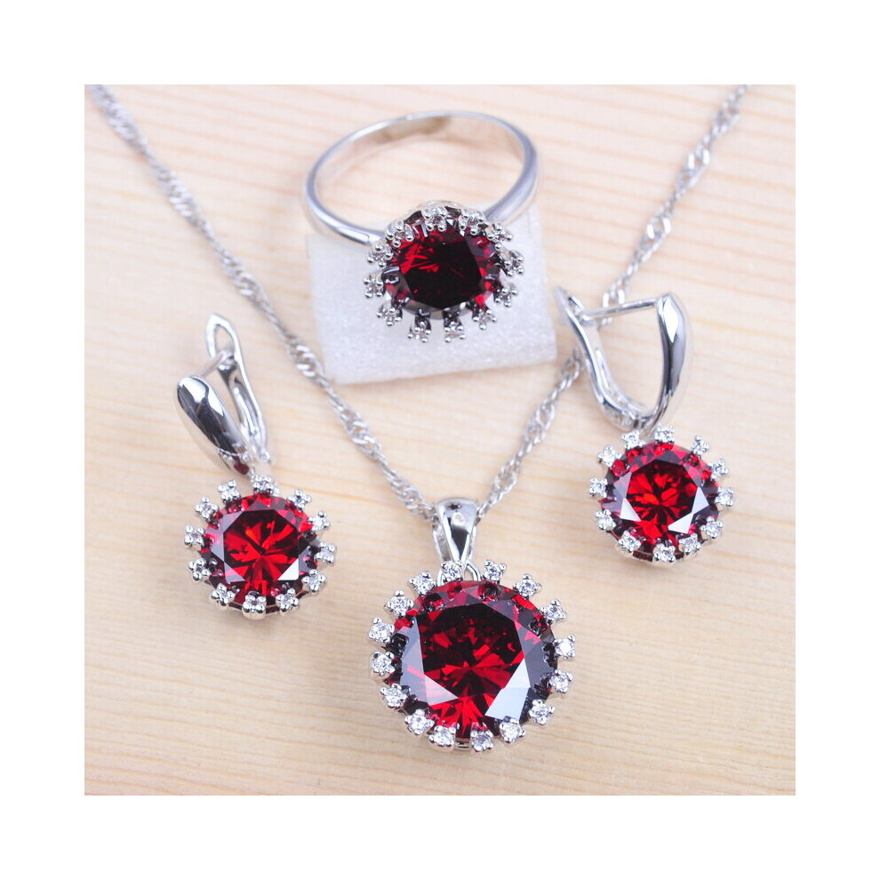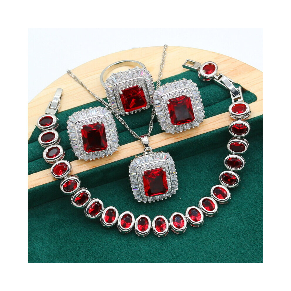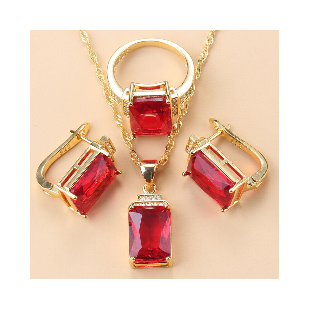 (3 PCS Jewelry Sets Imitation Rhodium Plated-9) For Women Dubai Red Zirconia Wedding Jewelry Set Crystal Pendants Necklace Earring Ring Party Jewelry