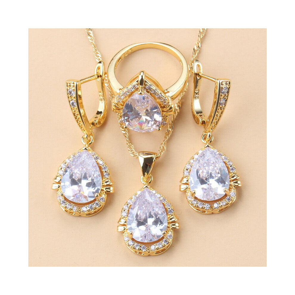 (Light Yellow Gold Color, 9) Water Drop Zircon Dubai Wedding Jewelry Sets for Women Bracelet Necklace Pendant Earrings Ring Gift