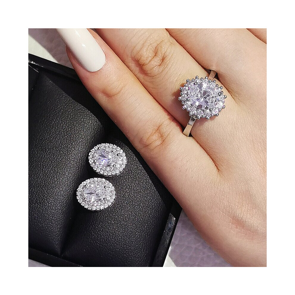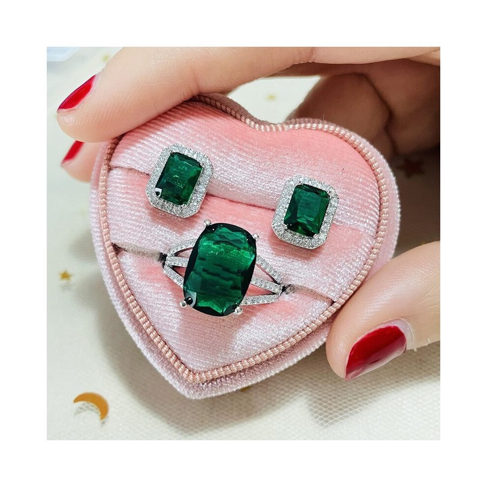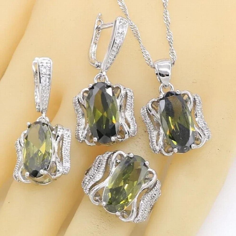 (Gold-color, 9) 2Pcs Green Silver Dubai Bridal Jewelry Set Oval AAA+ Zirconia Ring Earrings for Women Wedding Party