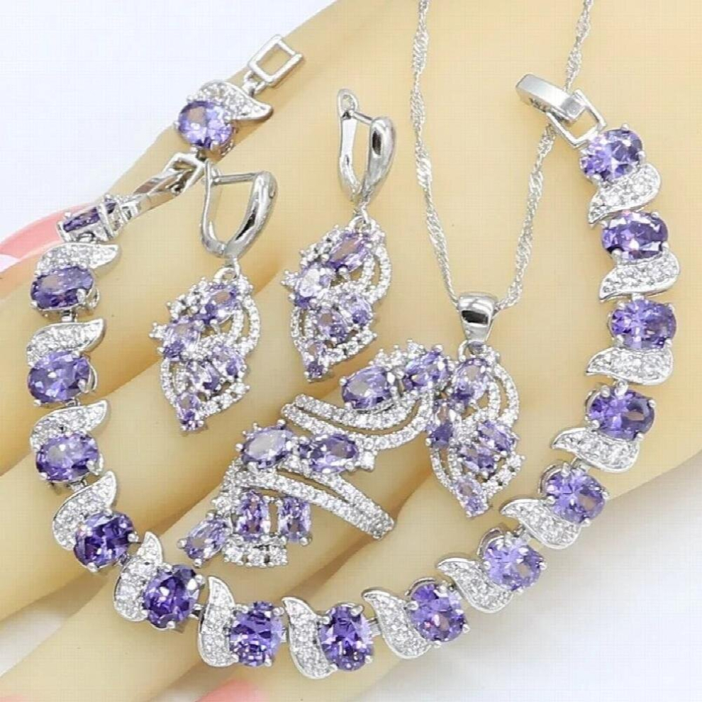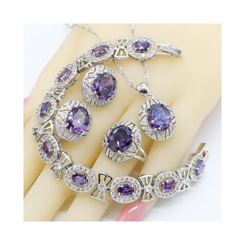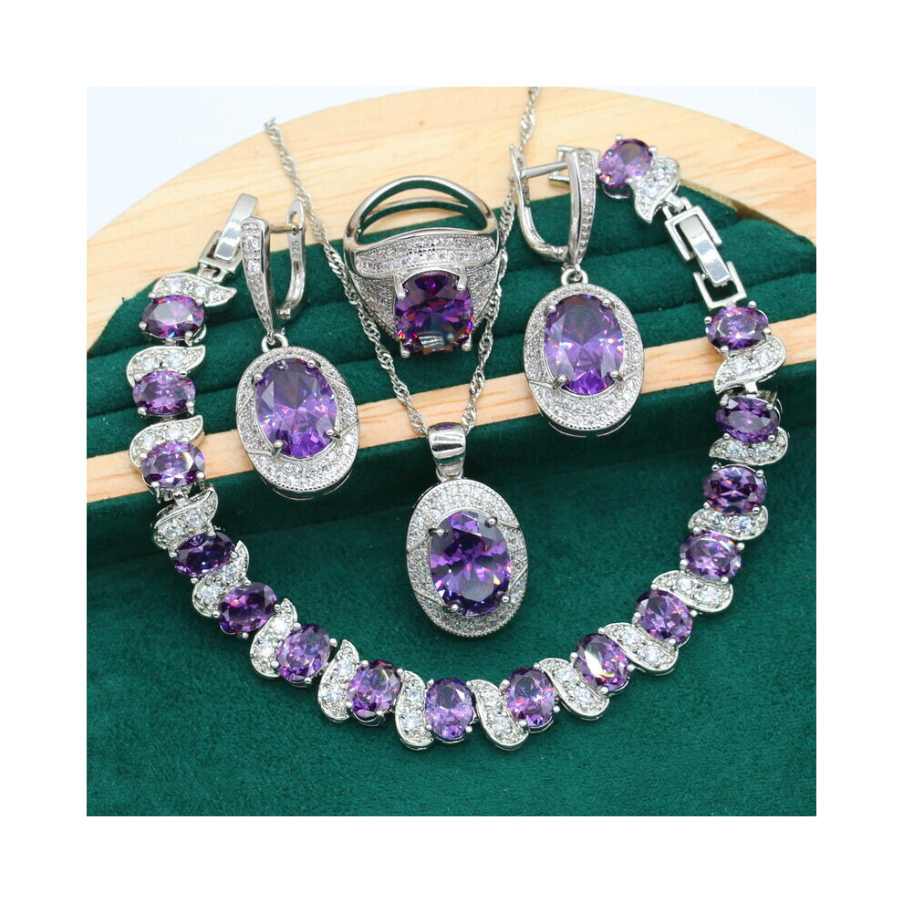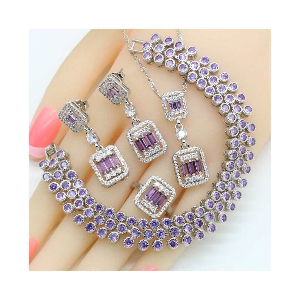 (Light Yellow Gold Color, 9) Noble Geometric Purple Zircon Silver Jewelry Set for Women Dubai Bracelet Earrings Necklace Ring Birthday Bridal Gift