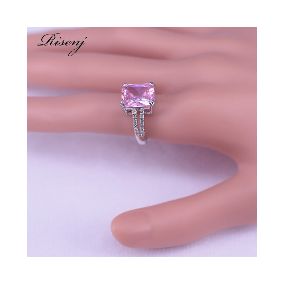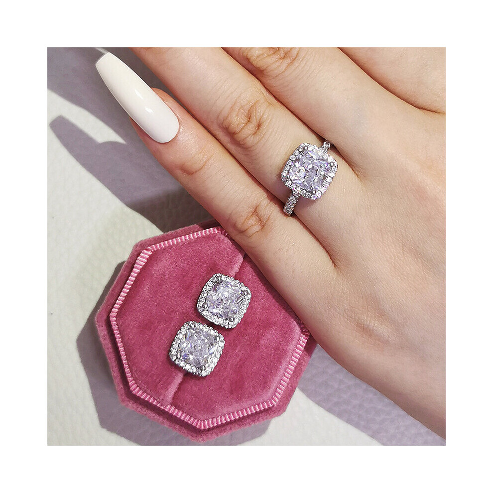 (Gold-color, 9) Dubai Silver Cushion CZ Jewelry Set Engagement Ring Stud Earring for Women Party Gift Size 11,12,13 J1099-pink