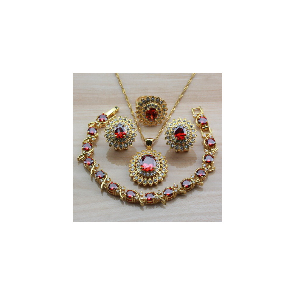 (Light Yellow Gold Color, 9) Dubai Colors Wedding Accessories AAA+ Red Garnet Bridal Jewelry Sets For Women Charm Bracelet And Ring Sets