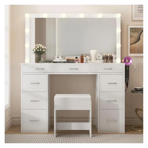 IEDHNGXN desk chair,makeup organizer 47 Inch Glass Top Dressing Table With Mirror And Light With 9 Drawer Makeup